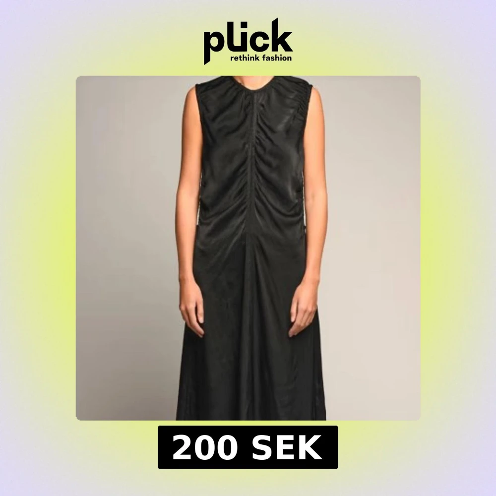 Säljer en svart ärmlös klänning med snygga rynkade detaljer framtill och baktill. Klänningen är från Arket har knytband i midjan för justerbar passform och är tillverkad i ett mjukt, lätt material som ger ett elegant fall.