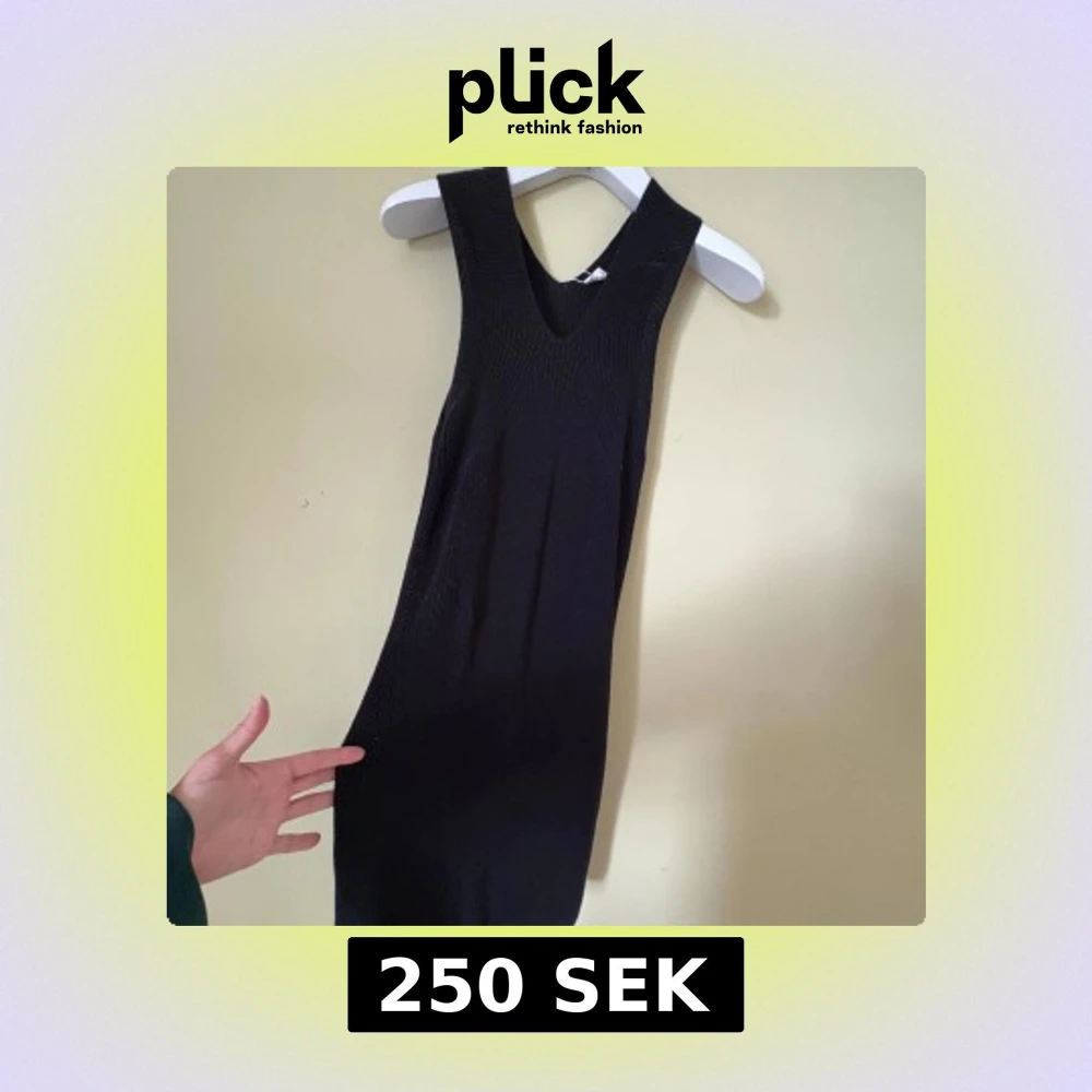 Supersnygg svart stickad klänning i storlek M. Modellen är ärmlös med breda axelband och v-ringad hals. Materialet är grovstickat och ger en cool struktur.