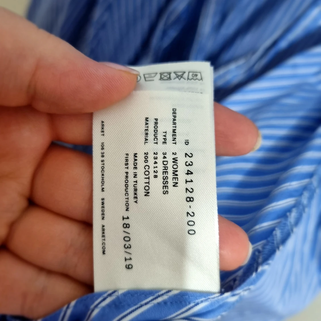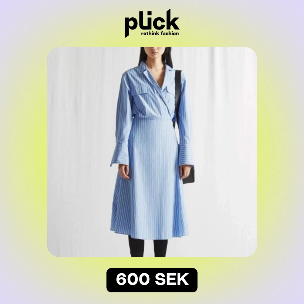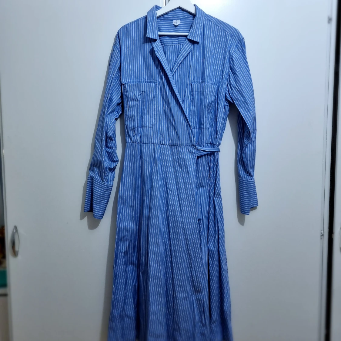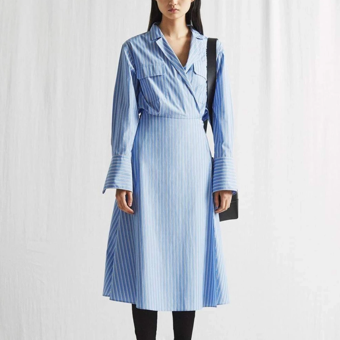 Den här långärmade skjortklänningen är gjord av bomull och är designad med en omlottfunktion och en knytdetalj i midjan. Använd knappt och har bra skick inga fläckar.