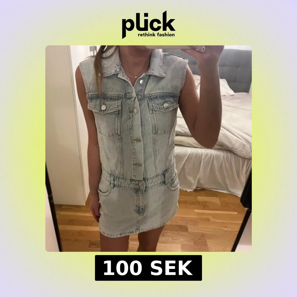 Snygg ljusblå ärmlös jeansklänning från Pull&Bear med klassisk krage, knappar framtill och fickor både fram och bak. Skulle säga att den är ganska liten i storleken!