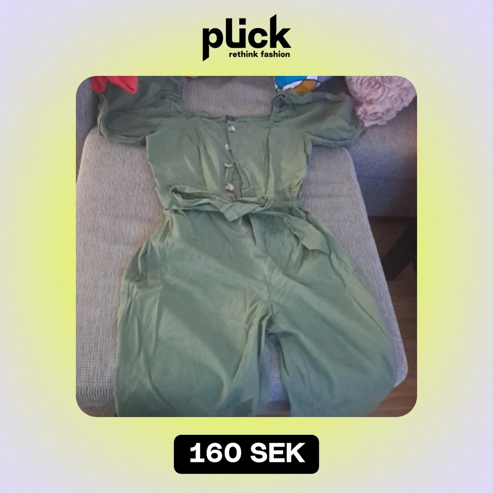 En grön klänning med knappar framtill och ett knytbälte i midjan. Klänningen har korta puffärmar och en fyrkantig halsringning. Den är knälång och har en lös passform. Använd bara 1 gång när jag tagit kort på!