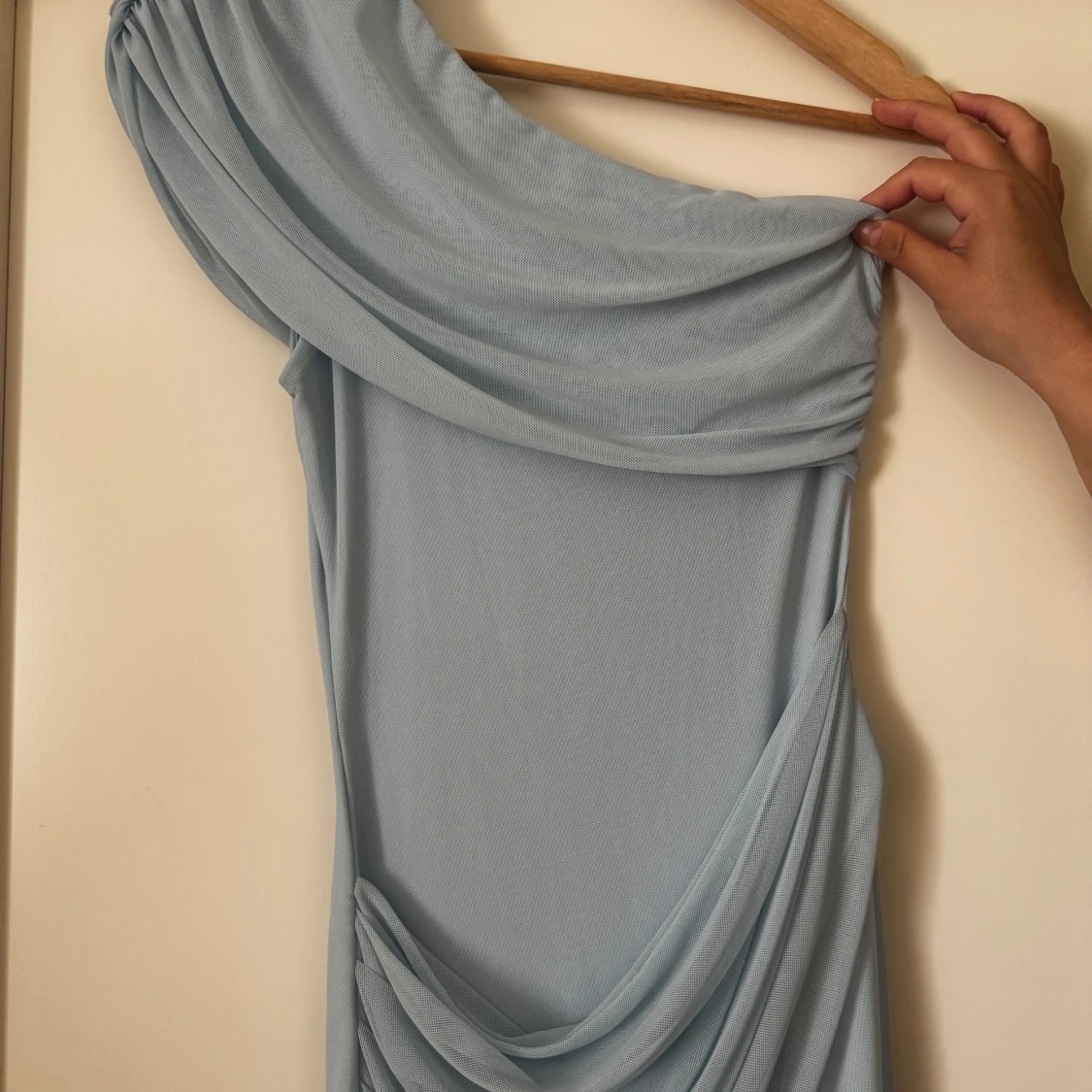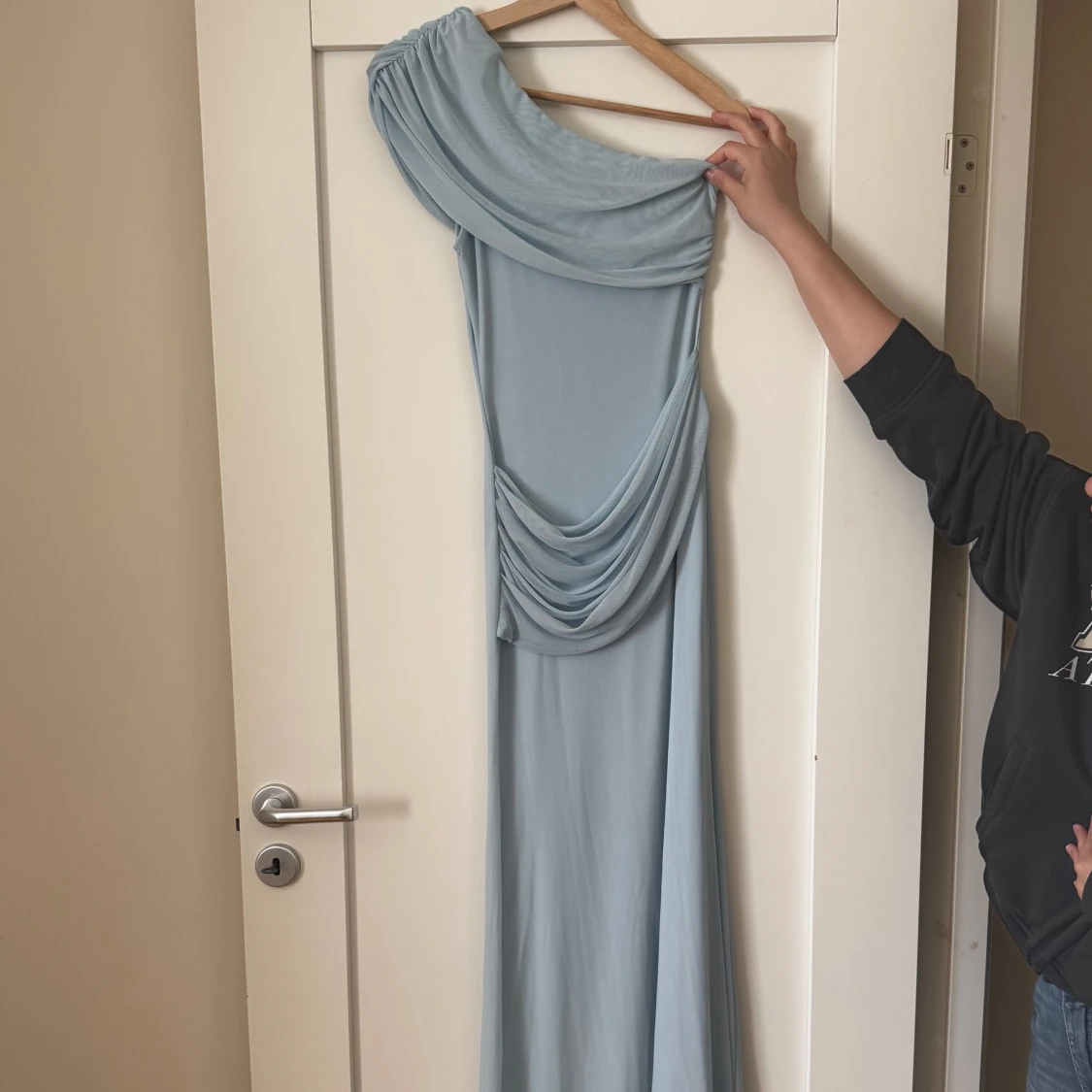 Säljer en elegant ljusblå långklänning med unik drapering och en axel. Klänningen har en asymmetrisk design och är perfekt för speciella tillfällen. Materialet känns mjukt och följsamt mot kroppen.