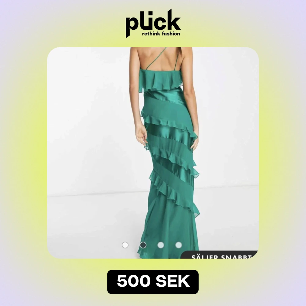 Fantastisk grön balklänning med volanger. Den har en elegant oneshoulder-design. Klänningen är i ett mjukt och följande material som ger en vacker siluett. Använd 1 gång på bal, därav små fläckar nertill