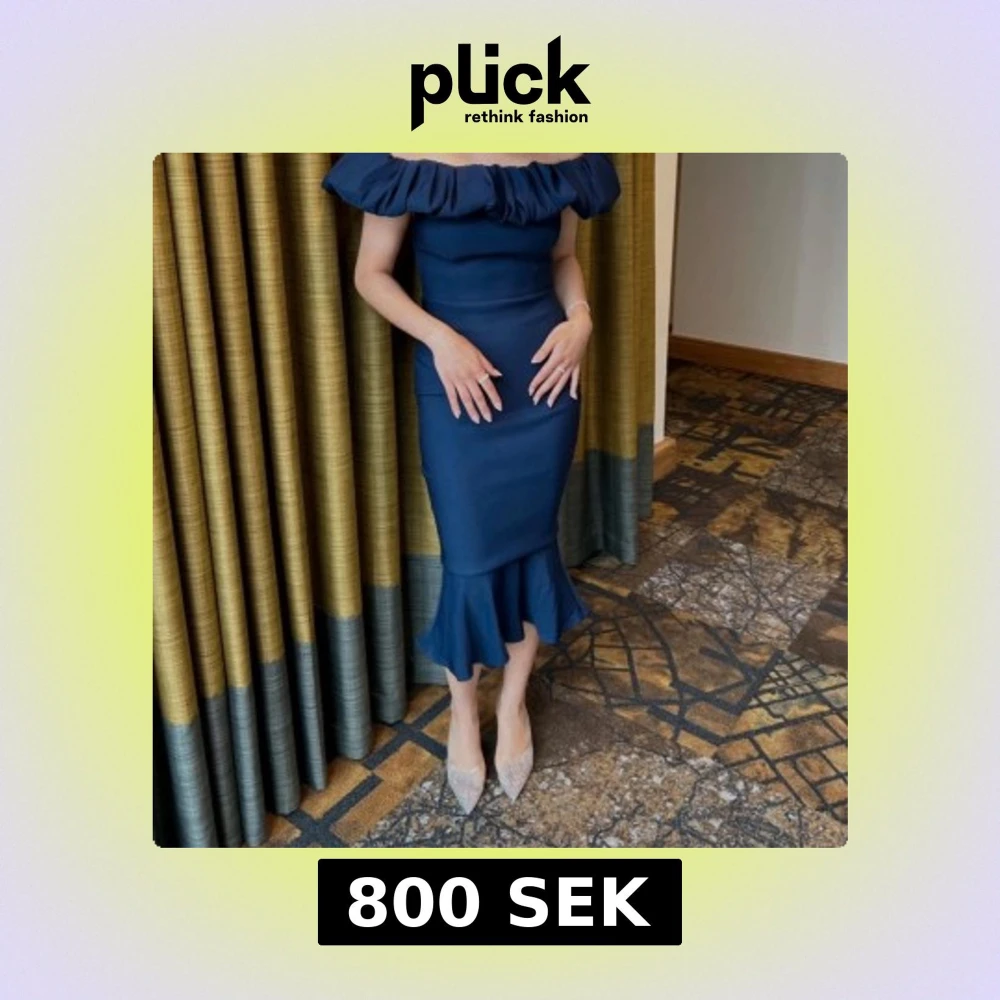 Säljer en marinblå offshoulder klänning med volangdetalj vid halsringningen och nederkanten. Klänningen har en tight passform och är tillverkad i ett slätt material. Perfekt för festliga tillfällen.