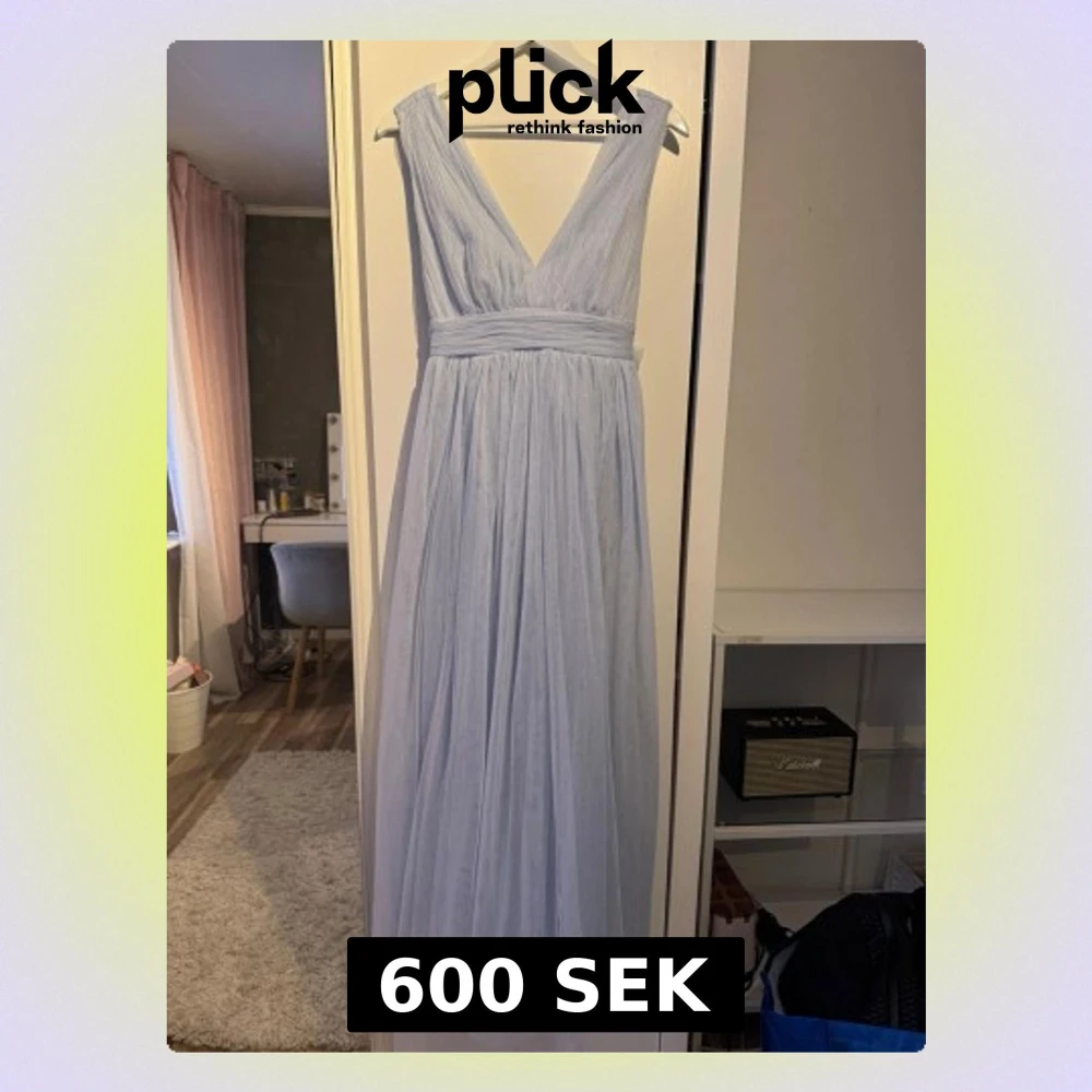 Säljer en ljusblå långklänning med omlottdesign och djup v-ringning. Klänningen har breda axelband och ett markerat midjeband som knyts i en stor rosett bak. Tillverkad i ett tunt, flygigt tyllmaterial som ger en romantisk känsla.