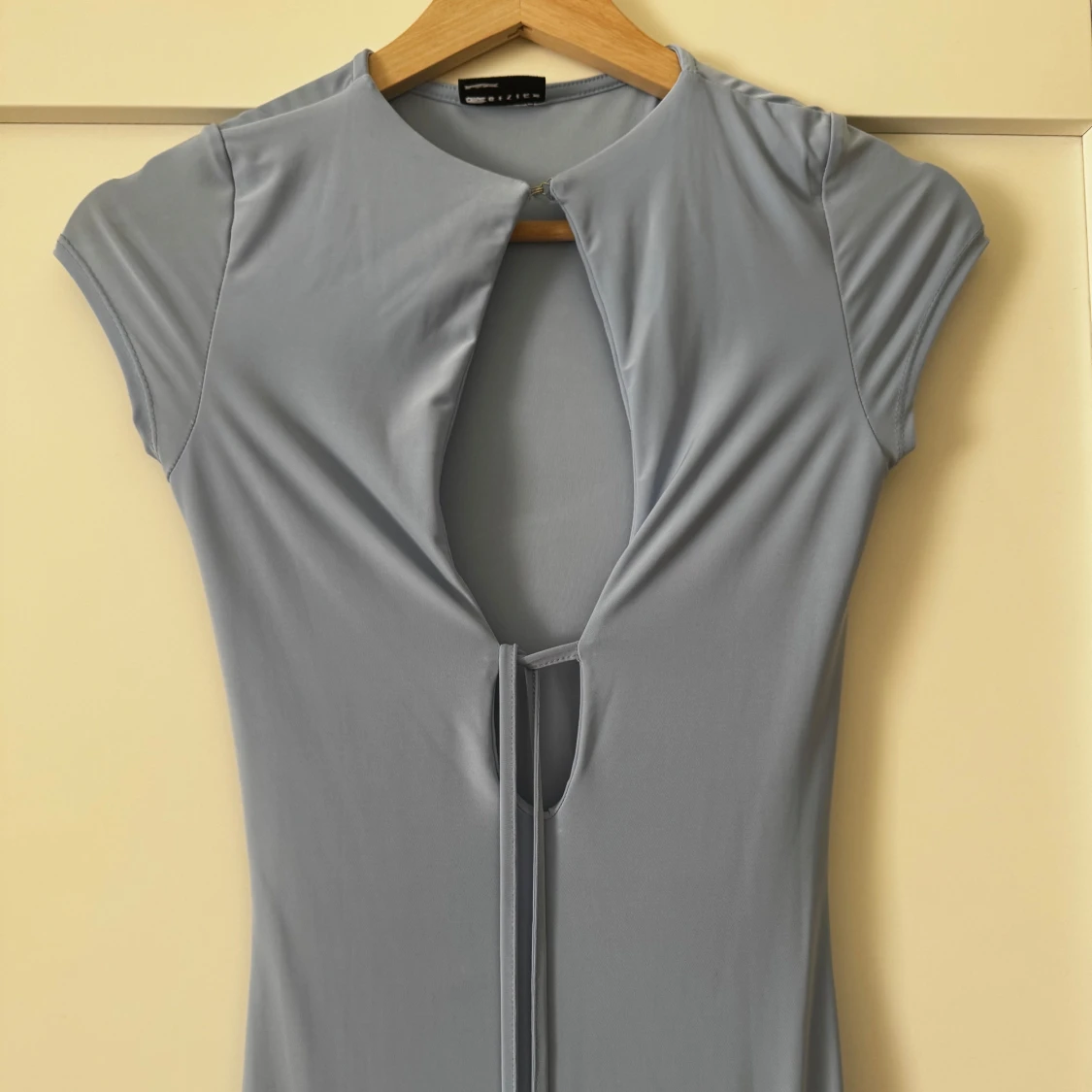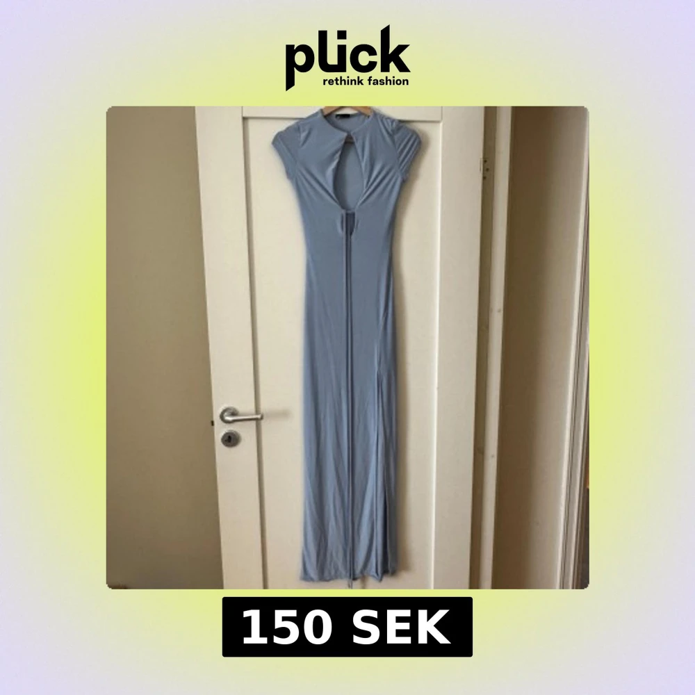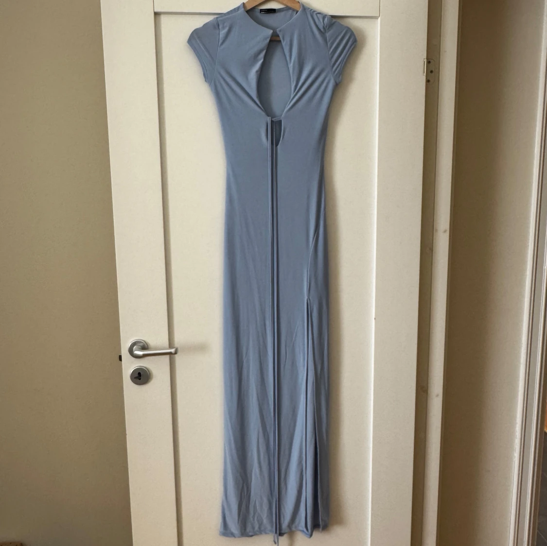 Säljer en ljusblå långklänning från ASOS med korta ärmar och snygg v-ringning framtill. Klänningen har ett knyt under bysten och är figurnära upptill. Perfekt för sommarens tillfällen!