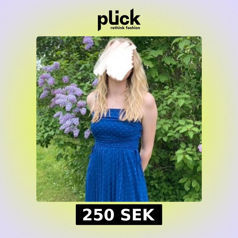 Säljer en blå långklänning med smala axelband och diskret prickigt mönster. Klänningen har rynkade detaljer upptill och ett lätt, luftigt tyg som faller fint. Perfekt för bal/skolavslutning eller en fin sommardag💓