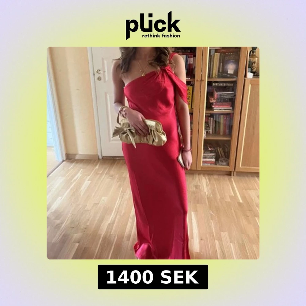 Säljer en elegant röd långklänning med oneshoulder-design. Klänningen har en slät och glansig yta som ger en lyxig känsla. Perfekt för speciella tillfällen när du vill sticka ut och känna dig extra fin. Endast använd en gång!