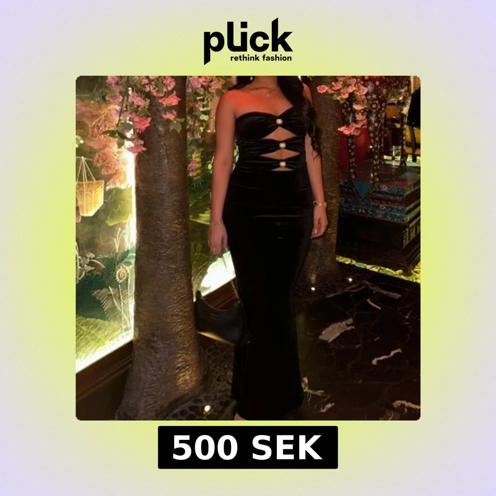Supersnygg svart axelbandslös långklänning med cut-outs framtill och dekorativa pärlknappar. Klänningen har en figurnära passform och är tillverkad i ett glansigt, sammetsliknande material som ger en lyxig känsla.