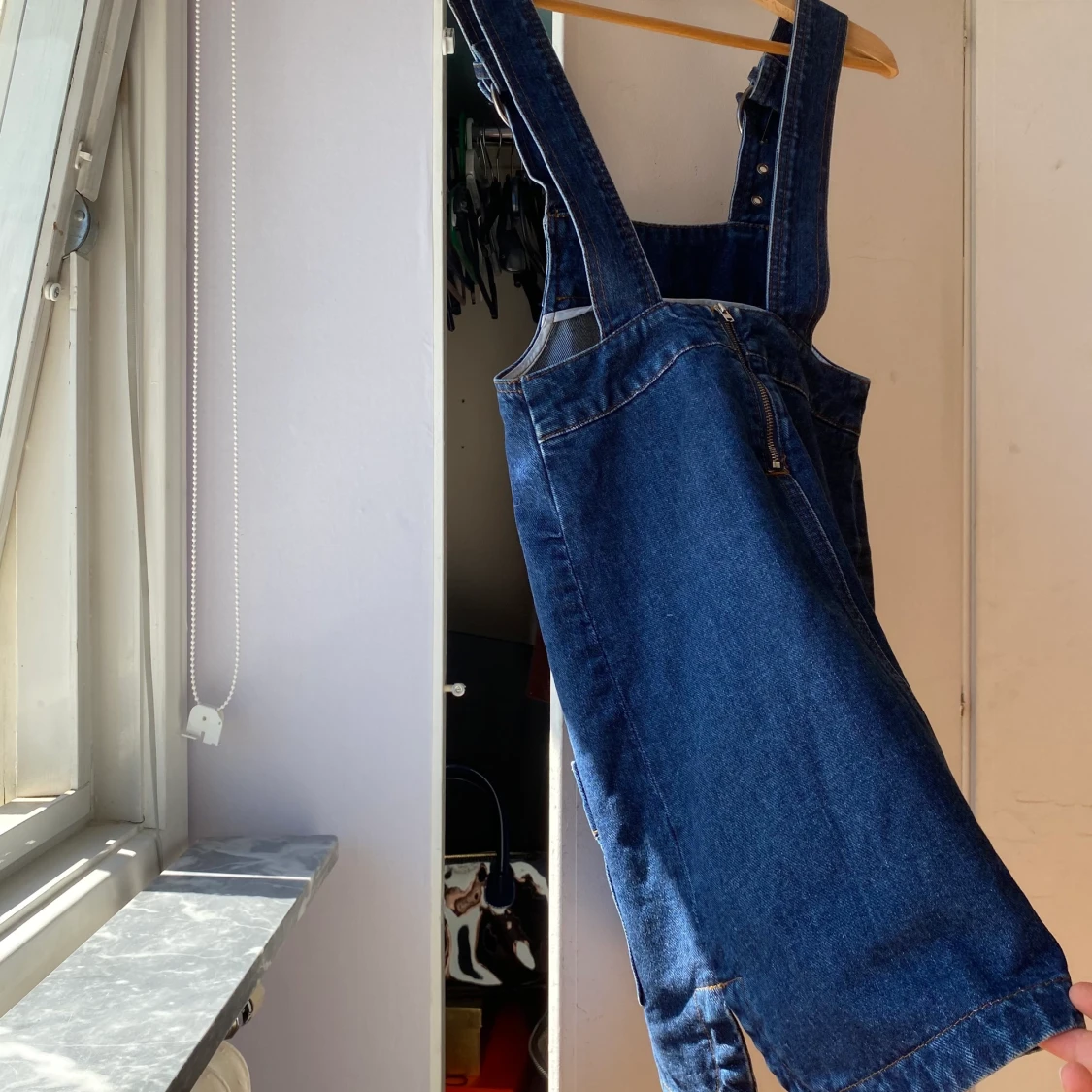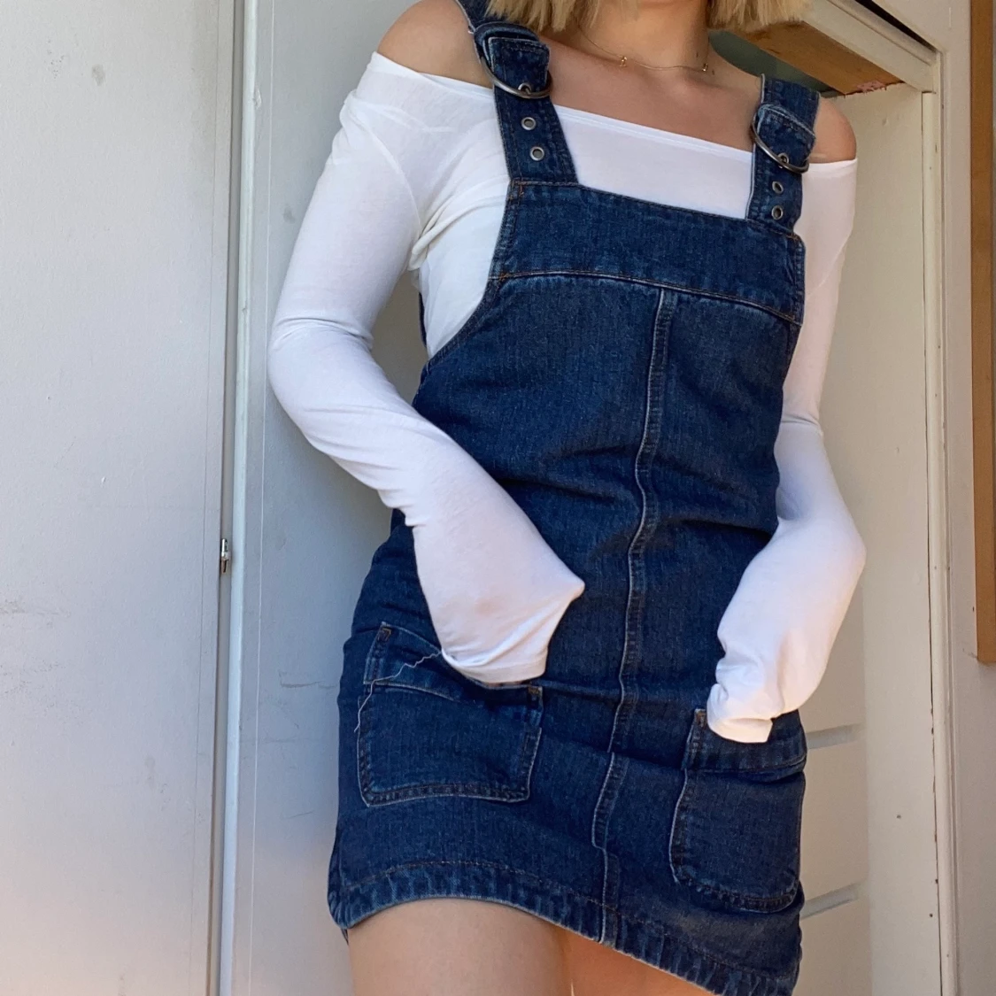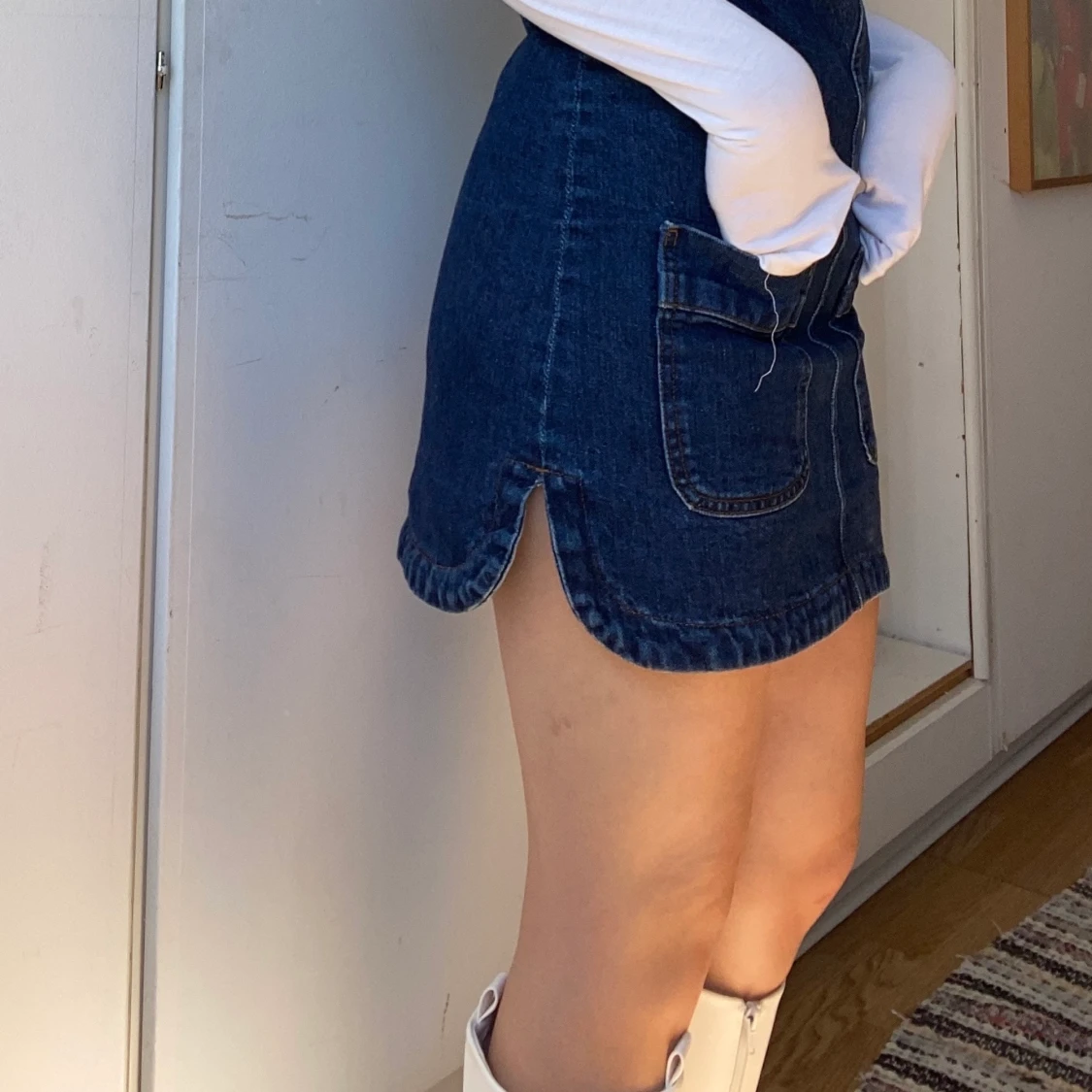 Blå jeansklänning i jättebra skick thriftad på Beyond Retro. Justerbara band och liten slits i sidan. Säljer pga lite liten för mig- dvs aldrig använd av mig! Ursprungligen från ASOS. Stl 32 och skulle själv uppskatta som en XS.