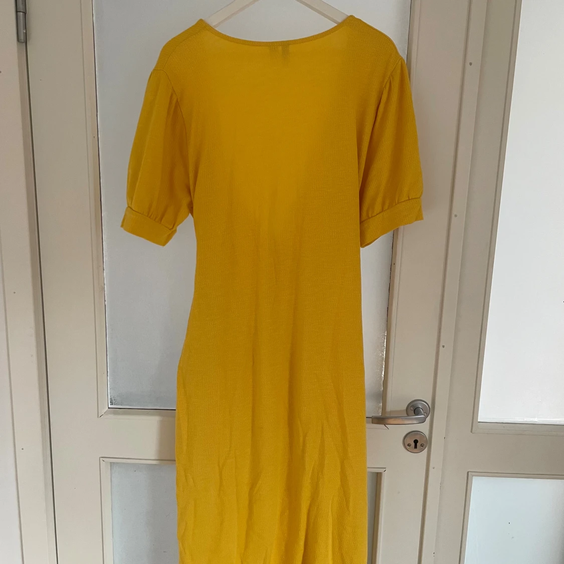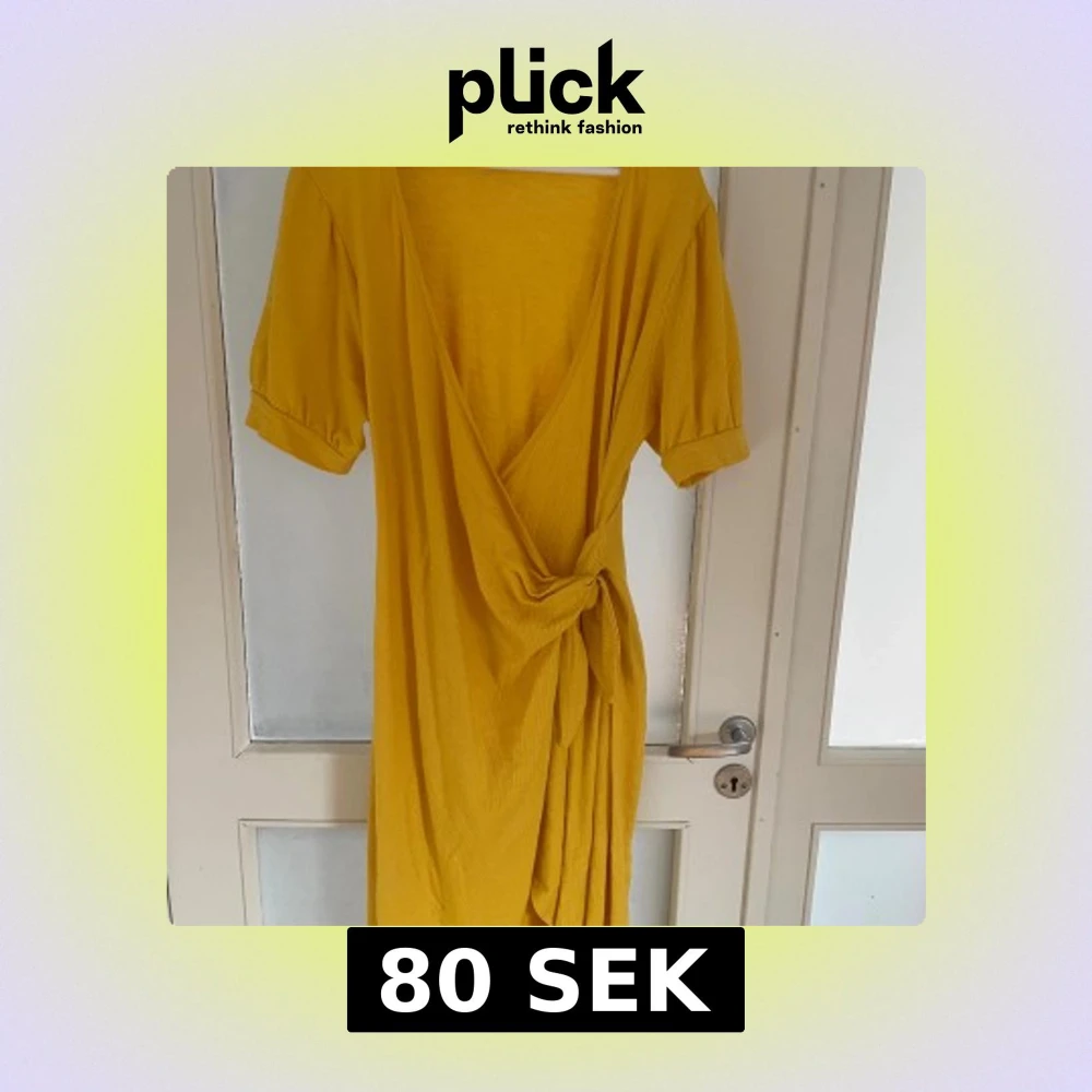 Säljer en lång gul omlottklänning från ASOS med puffiga korta ärmar och knyt i midjan. Klänningen har djup v-ringning och är tillverkad i ett mjukt bomullsmaterial. Perfekt för dig som gillar färg och vill sticka ut.