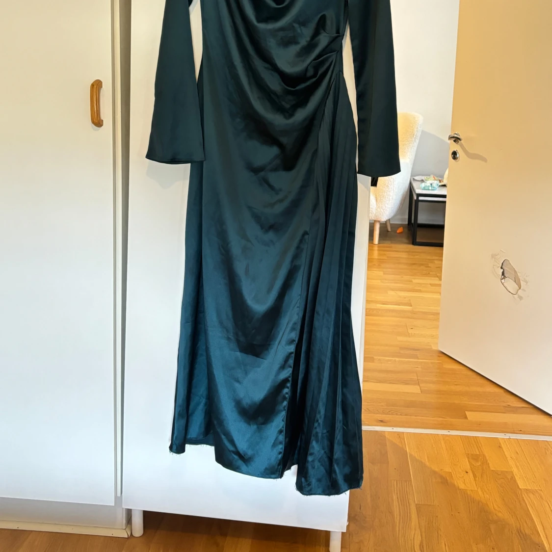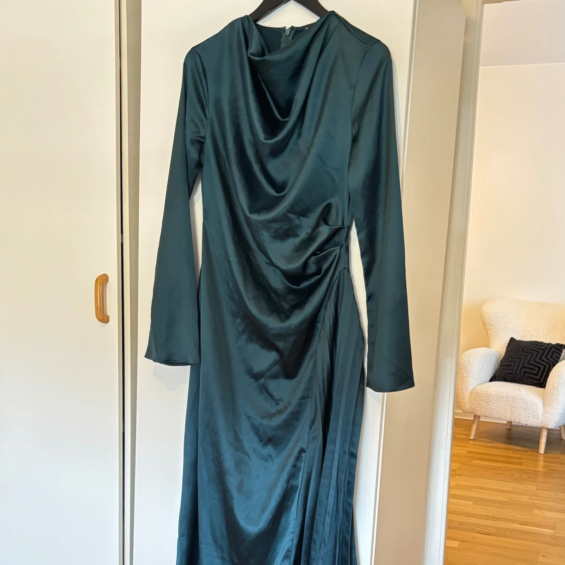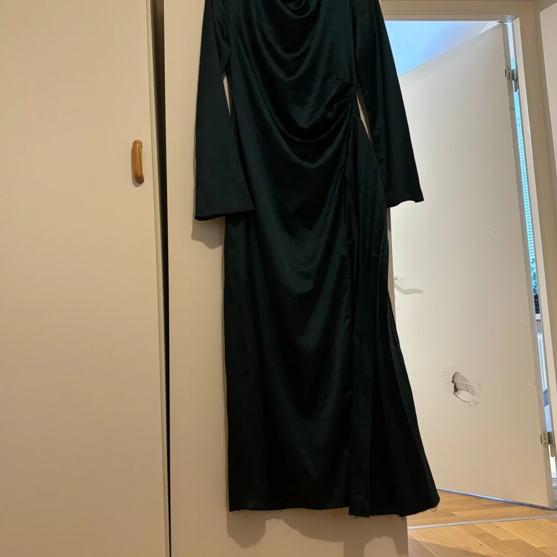 Slutsåld på ASOS Storlek L passar även M Enda defekt är trådar längst ner som inte syns och som går att klippa bort. Påverkar inte sömmen. Ser ut som utlydd som kommer från insidan på klänningen