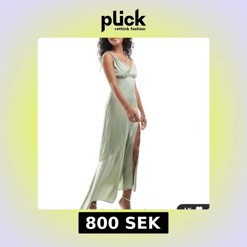 Elegant ljusgrön långklänning i satin med smala axelband och djup v-ringning. Klänningen har en slits på sidan som gör den lätt att dansa i. Oanvänd med lapparna kvar då jag missade att returnera den i tid. Nypris 969kr