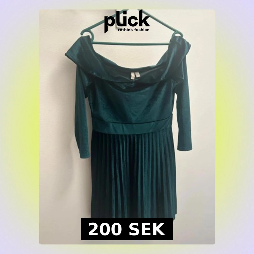 Supersnygg mörkgrön klänning från Asos i mjuk sammet med plisserad kjol och offshoulder-ringning. Klänningen har trekvartsärmar och markerad midja som ger en elegant siluett. Perfekt för dig som vill sticka ut med stil på nästa tillställning.