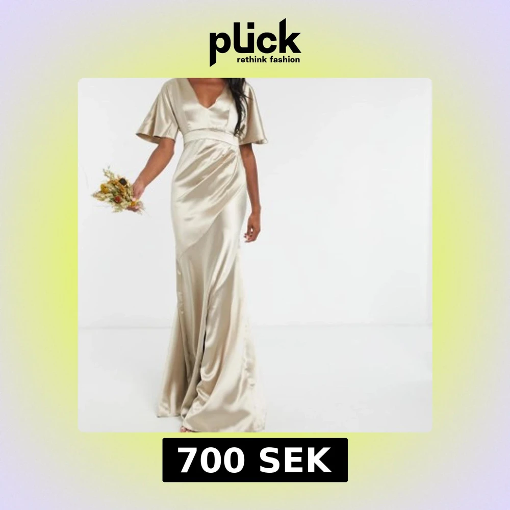 Långklänning i satin från Asos, perfekt som balklänning!! Den är insydd från höfterna och nedåt så den är smalare än på de två första bilderna. Lappen är avklippt men passar S/M. Måtten rakt över är midja 36 cm, höfter 50 cm och längst ner 62 cm. Från axeln ner till fötterna är den 150 cm. Skriv om du har frågor eller vill ha fler bilder💞💞den är i fint skick men har lite små märken som satin lätt får, men det är inget som man lägger märke till😇 färgen är skimrande beige/champagne. Nypris ca 1200