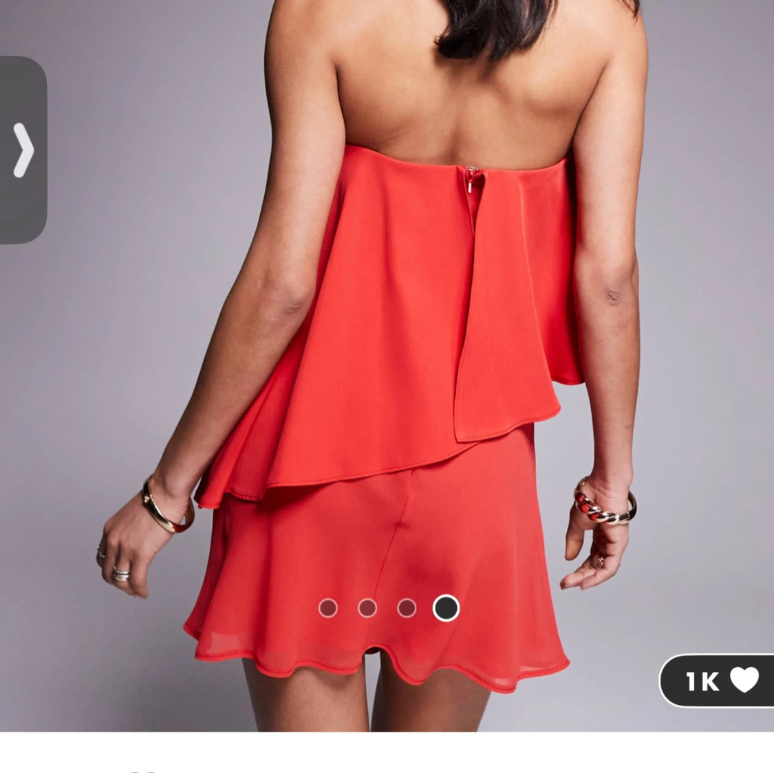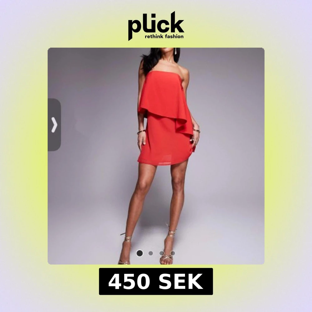Snygg röd axelbandslös kortklänning med volangdetalj. Såå snygg men tyvärr lite kort på mig (är 172), jättefin o passar till många tillfällen. Aldrig använd, ny pris 700