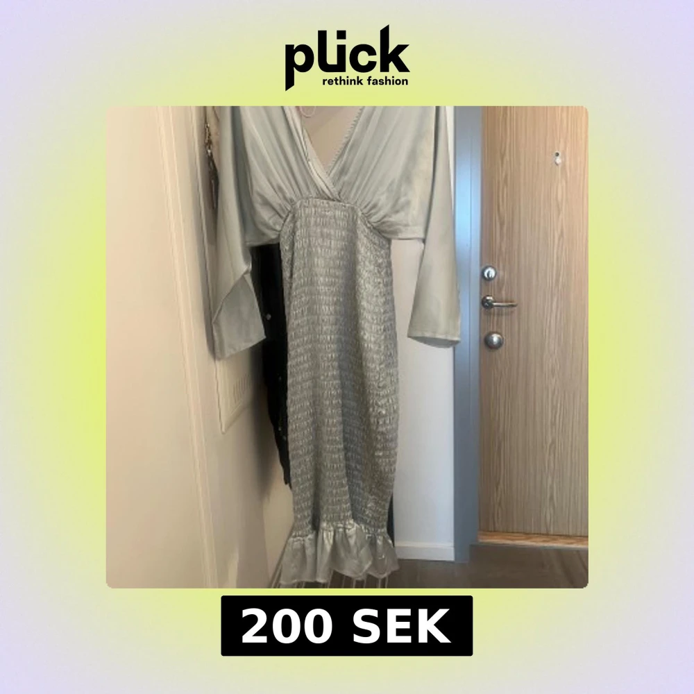Supersnygg ljusgrå långklänning med omlottliv, v-ringning och långa ärmar. Kjolen är smockad och avslutas med en volangkant. Funkar för S och M eftersom den är stretchig.