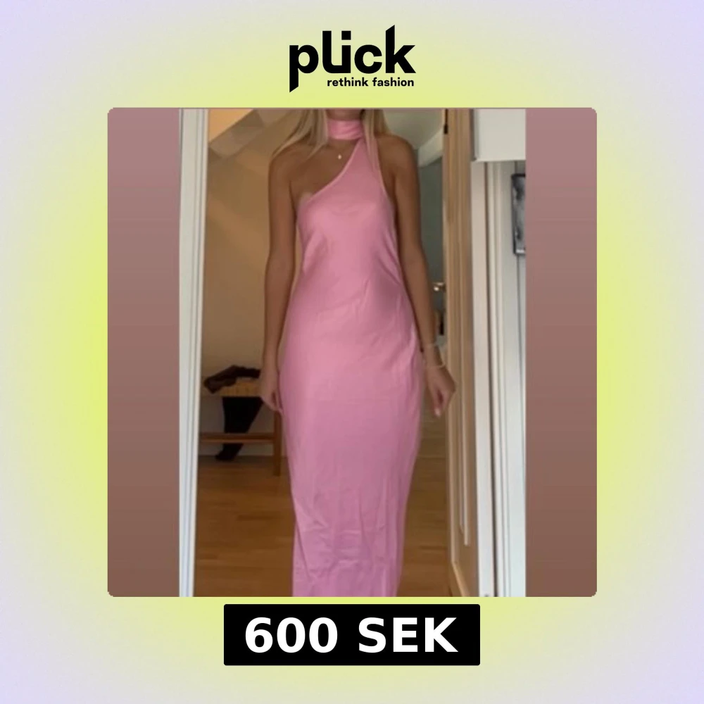 Säljer en snygg rosa långklänning med one shoulder och scarf. Klänningen har öppen rygg med knytband. Helt oanvänd med prislapp kvar. Jag är 175 cm och går precis till marken