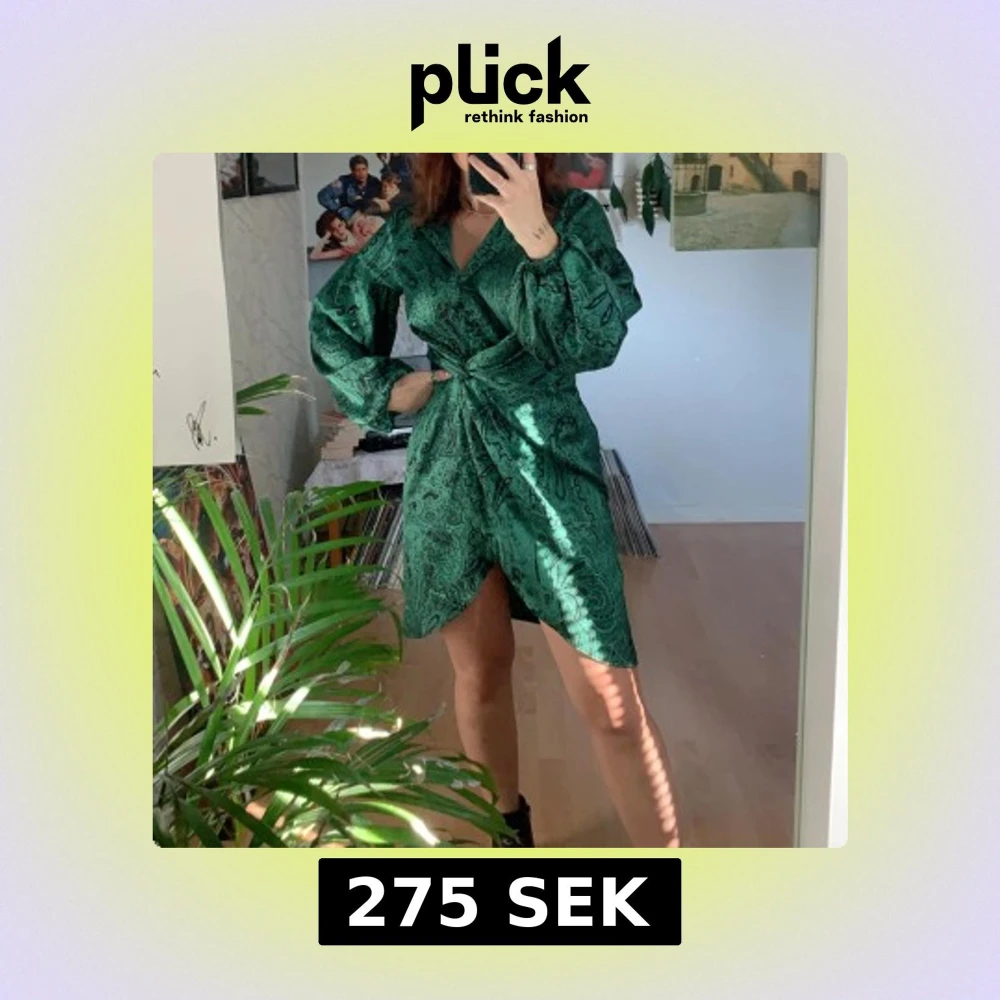 Snygg grön kortklänning med svart paisleymönster och omlottdetalj i midjan. Klänningen har långa puffärmar, krage och v-ringad hals. Materialet är glansigt och känns lyxigt.