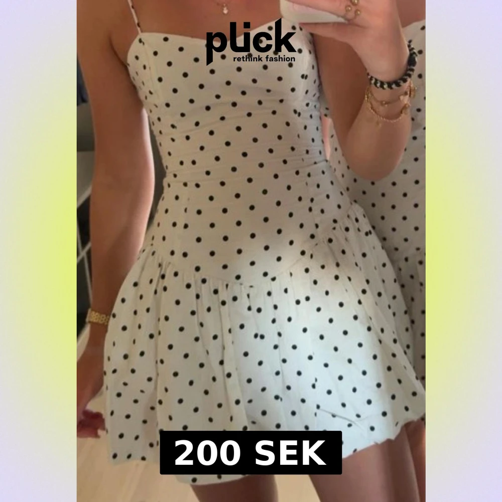 Supersöt vit kort klänning med svarta prickar och tunna axelband. Klänningen har en figurnära överdel med hjärtformad urringning. Perfekt för sommaren! Den är endast använd en gång och är i jättefint skick🥰