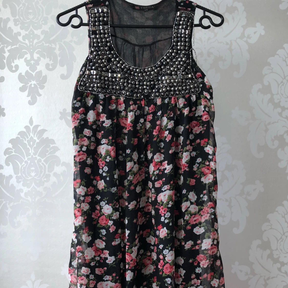 Blommig kort chiffong klänning/tunika. Lite trasig se bild 3. Annars bra skick. 80cm från axel