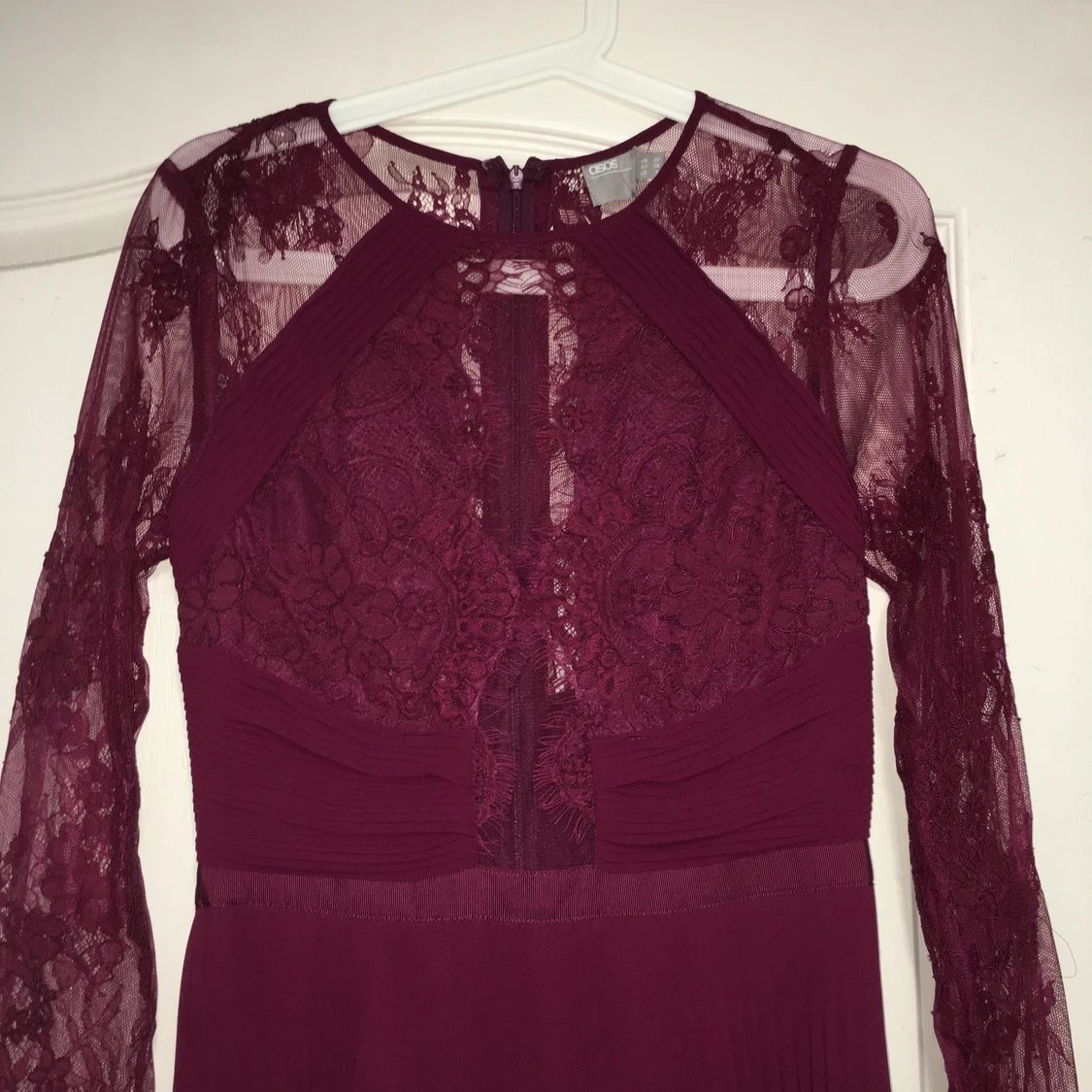 Mycket fin och elegant vinröd maxiklänning, perfekt för bröllop både som gäst och brudtärna! Överdelen är mesh och spets, nederdelen är plisserad chiffong och lätt fodrad med siden. Oanvänd, med tagg kvar. Nypris: 1200kr
