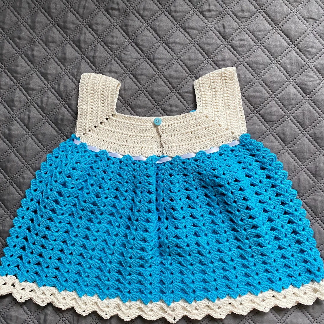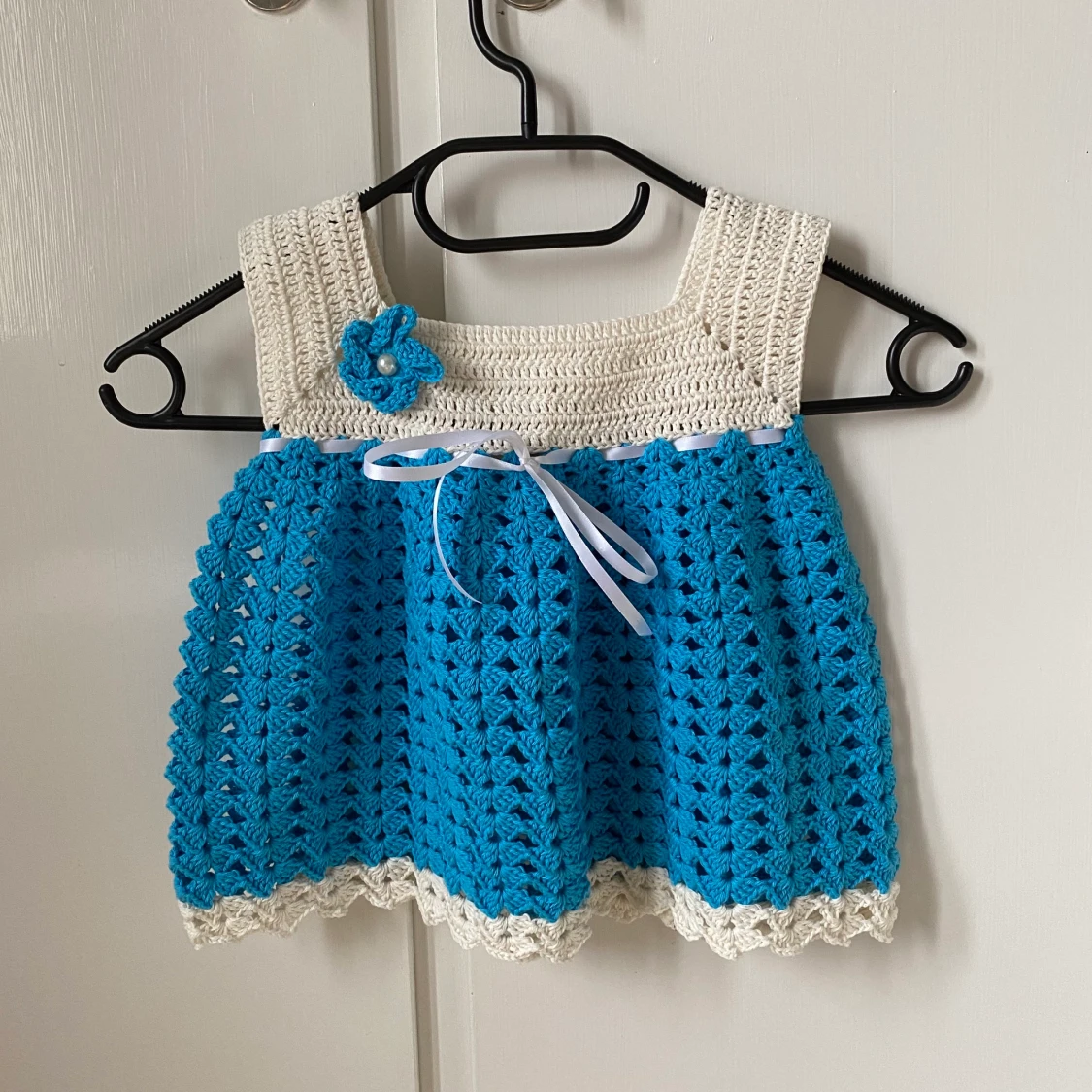 Denna baby klänning har jag virkat själv. Den passar barn 3-6 månader Den är 40cm bred i kjolen och bröst mått är 24cm. På baksidan finns en knapp Garnet är av bomull och tvättas i 30 grader. Finns i rök och djurfritt hem