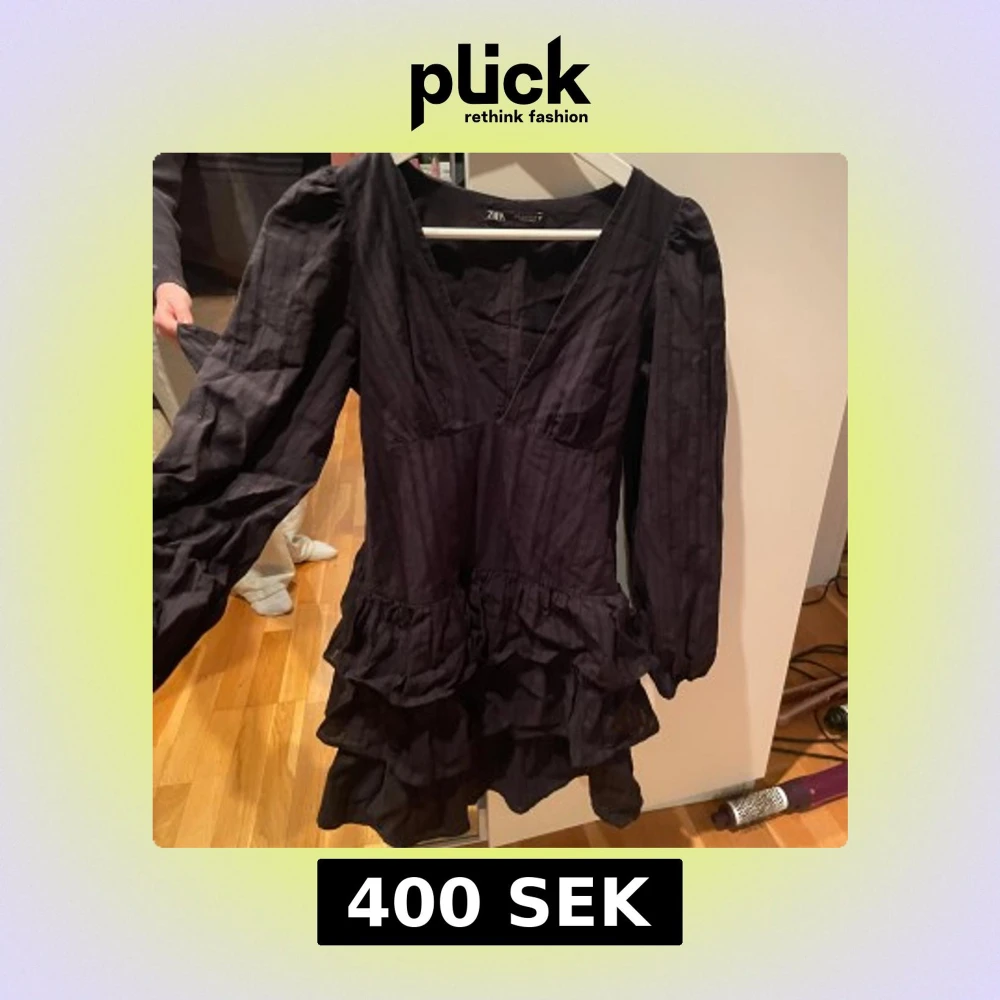 Världens snyggaste klänning från Zara med volanger och v-ringning. Går inte att få tag på längre. Klänningen har långa ärmar och en kort längd. Tyvärr blivit för liten🥲 använd ca 2 ggr🩷(lånad bild)