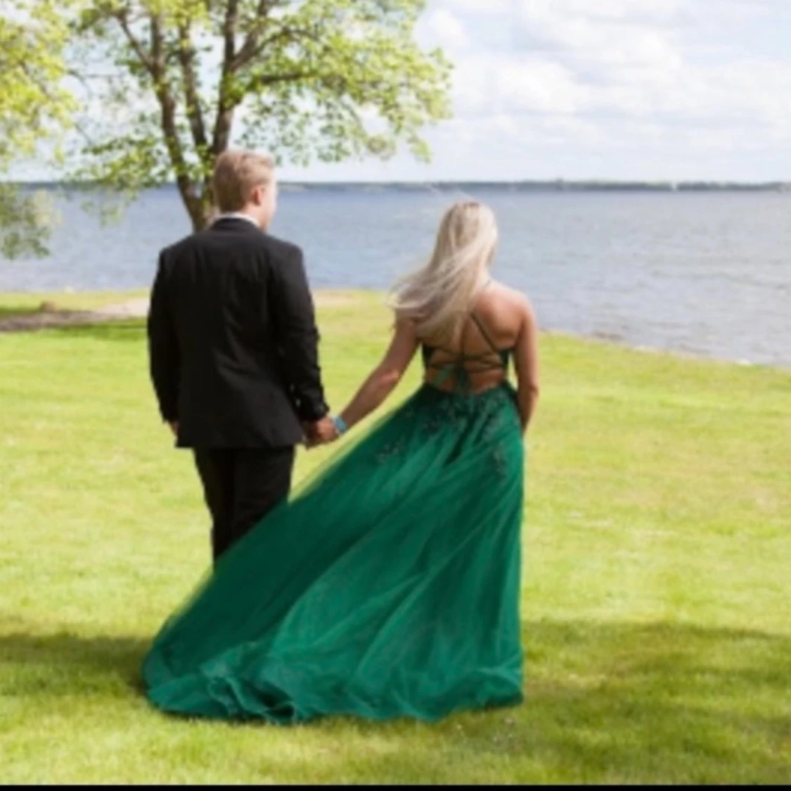 Jag säljer nu min magiska mörkgrön prinsessiga balklänning med djup v-ringning, spetsapplikationer och glittriga detaljer. Den har öppen rygg med snörning och tunna axelband. Den har även en fin slits på höger sida. Den går att anpassa i och med knytningen i bak. Den är i mycket bra skick. Använd 1 gång. Men då jag inte kommer gå på student bal igen så känns det dumt att ha kvar den därför säljer jag nu den vidare! Det är bara att skriva om fler bilder önskas! Ny pris 1850kr mitt pris 1200kr:)