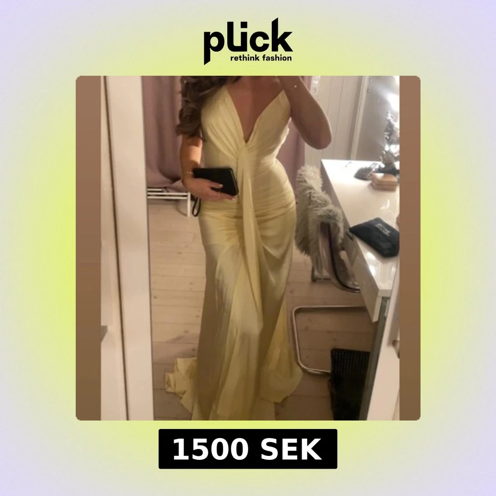 Elegant gul långklänning med djup v-ringad urringning och smala axelband. Klänningen har en draperad detalj framtill och en figurnära passform som ger en smickrande siluett. Perfekt för speciella tillfällen.