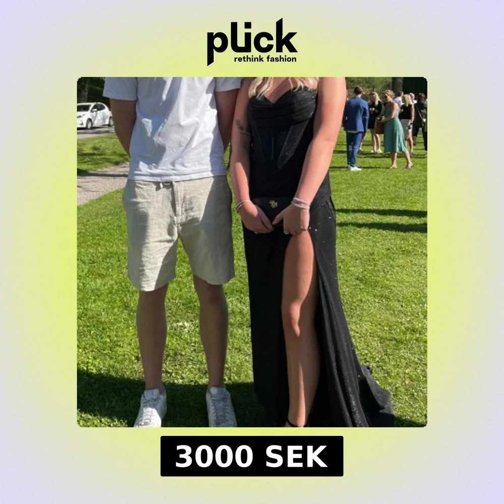En super fin balklänning/nyårsklänning, med slits och lite släp, den är svart men ser inte så svart ut då de är mycket glitter på den o den glittrar jätte fint i solen, jätte fin baktill, inga skador eller något på den, går att lösa mer bilder på den, klänningen är endast andvänd en gång , nypris 4190kr