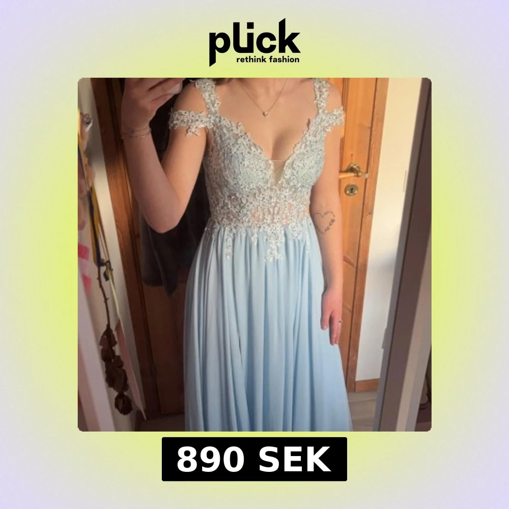 Säljer nu min fina balklänning, ljusblå med fina detaljer och slits vid vänstra benet. Köpt på Hebeos för ca 1400kr💕 Storlek S och går ner till marken på mig som är 168cm💖Använd endast under en dag!
