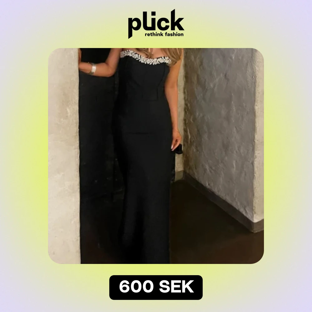Svart klänning med kristaller på som jag använde till min bal men man kan använda den till när man vill. Klänning är bekväm att ha på sig, ger en fin form och har slits på vänster sida. Endast använd 1 gång🌸