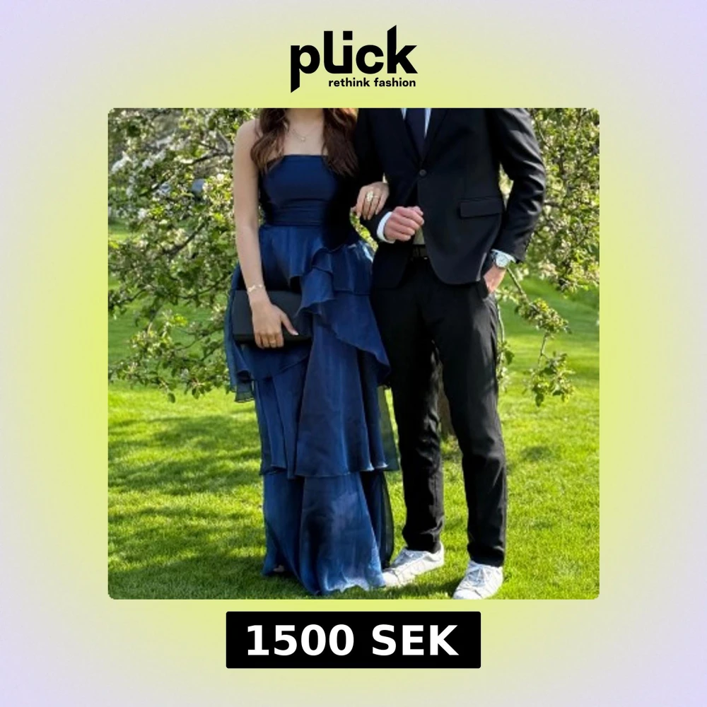 Säljer en marinblå balklänning med flera lager volanger och axelbandslös design. Klänningen har en snygg snörning i ryggen och är tillverkad i ett glansigt, lätt material som ger en lyxig känsla. Perfekt för bal! Fråga gärna om fler bilder eller mått. Klänningen är lite trasig längst ner men inget som syns mycket, och går lätt att laga med bara en enkel söm! På lappen står det storlek L men den passar mig perfekt som vanligtvis brukar ha S. Klänningen är bara använd en gång på min egna bal!🤗