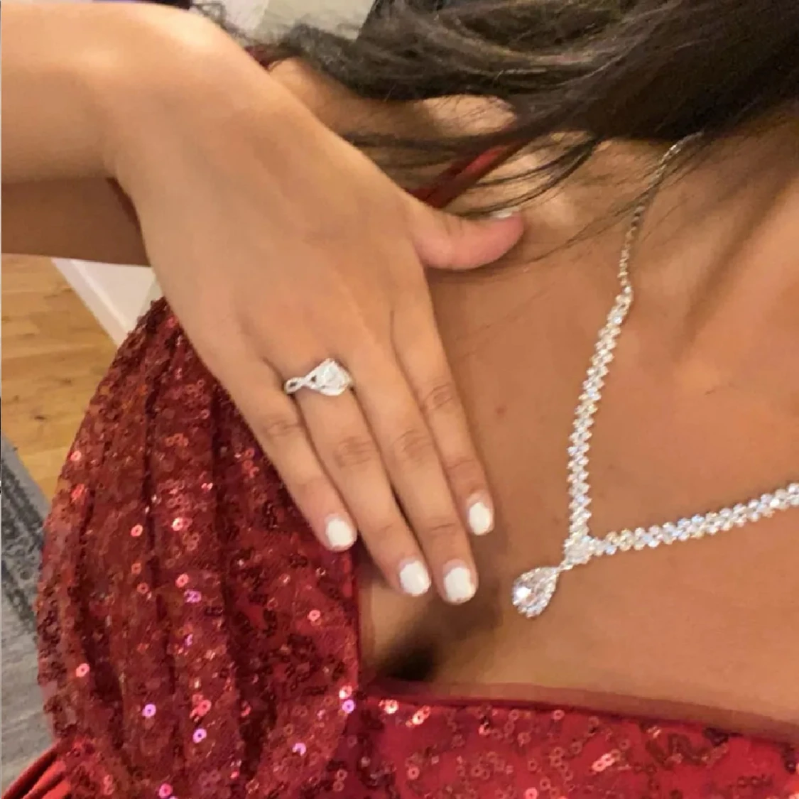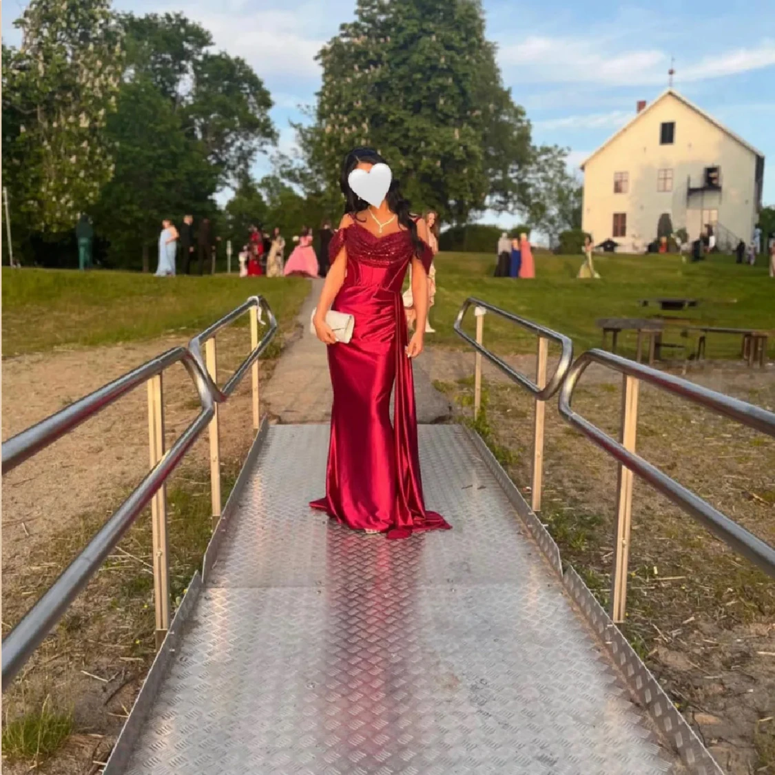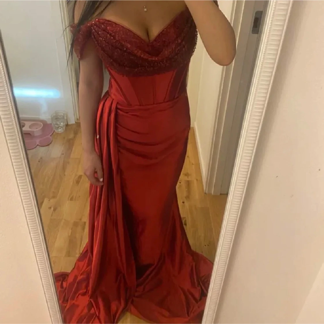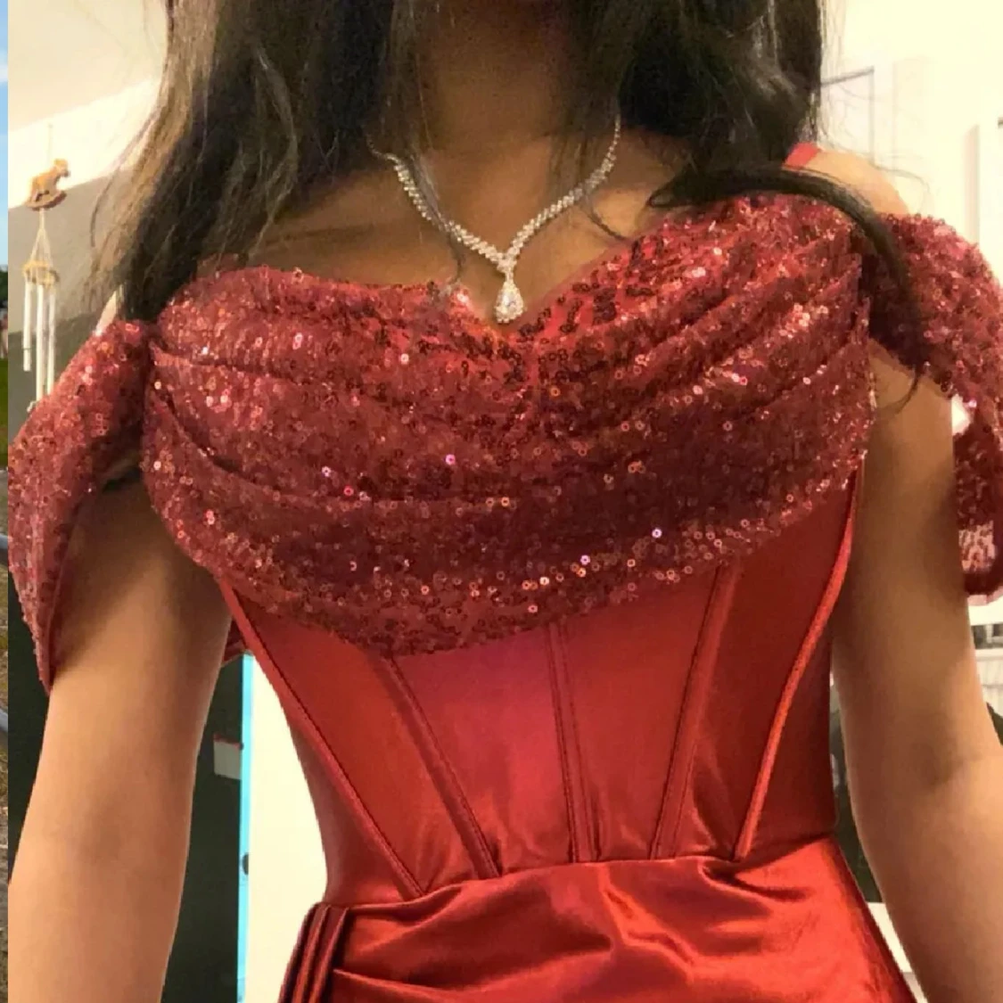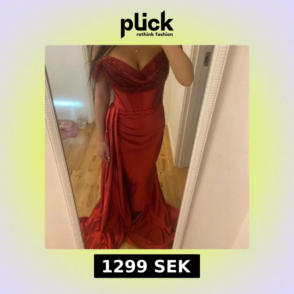 Säljer detta bal/fest paket som innehåller klänning, smycken, klackar och väska. Snygg vinröd långklänning i glansigt satin material med axelbandslös design och paljetter över bysten och ärmarna. Klänningen har en elegant drapering (korsett) framtill och stängs med dragkedja i ryggen. Jag har sytt upp den så den passar perfekt för dig som är 160-165 cm lång. Jag har även kvar delen som jag sytt bort om man är lite längre och vill lägga till det. Fri frakt kan lösas. Endast använda 1 gång.