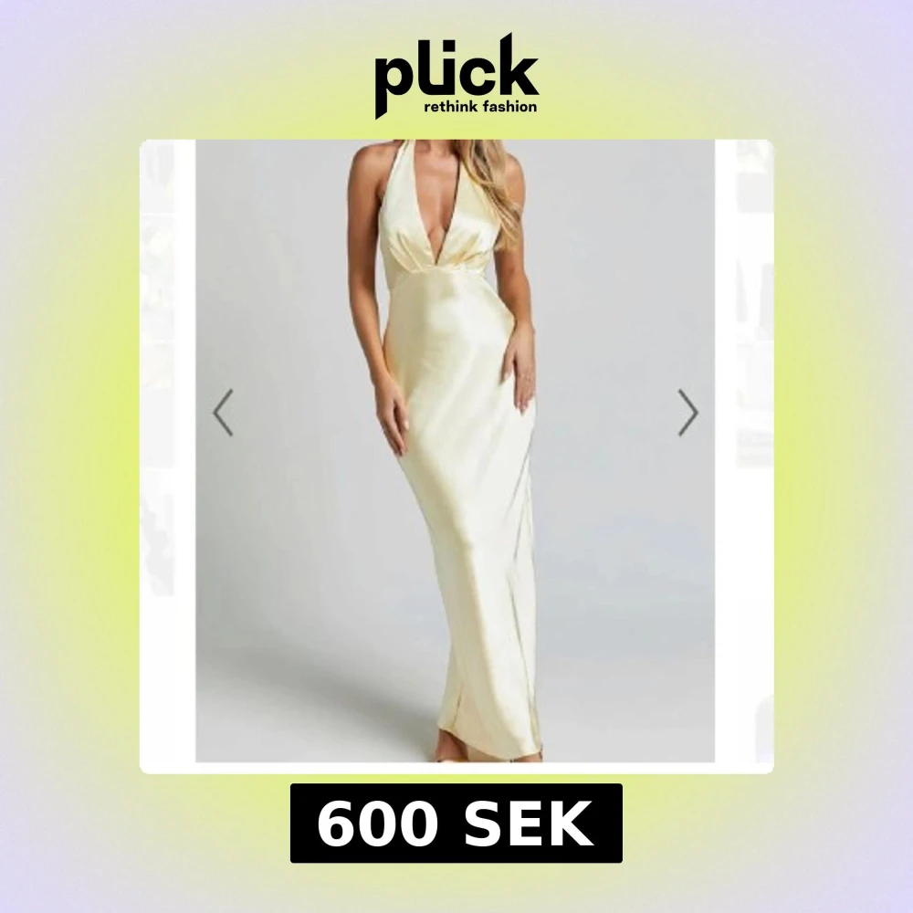 Elegant långklänning i ljusgul satin från Showpo med djup v-ringning, halterneck och öppen rygg. Verkligen jättefin men var tyvärr lite för kort för mig💗