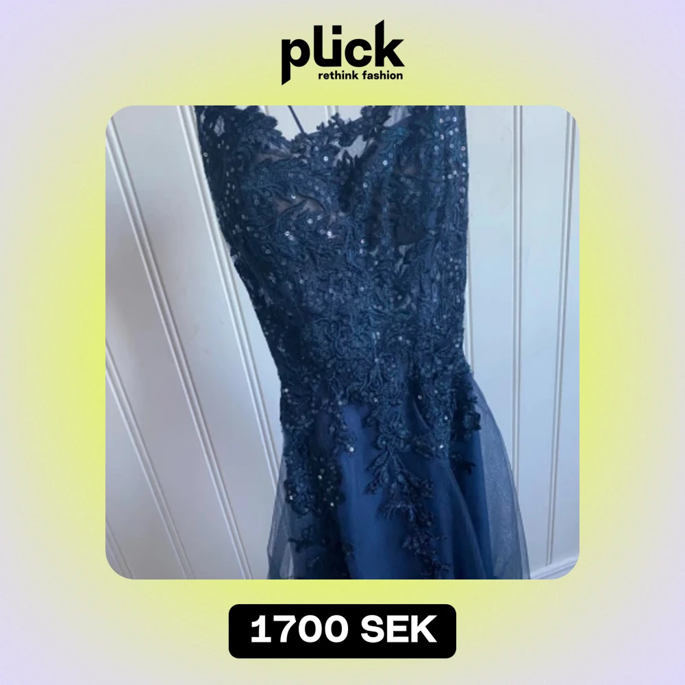 Mörk marinblå balklänning. Öppen rygg med knytning & en slits vid vänsterbenet. Storlek EU 32. Så gott som ny och endast använd en gång på min egna bal. Inga synliga skador. Klänningen går att justera med hjälp av snören i rygg. Nypris 2248kr
