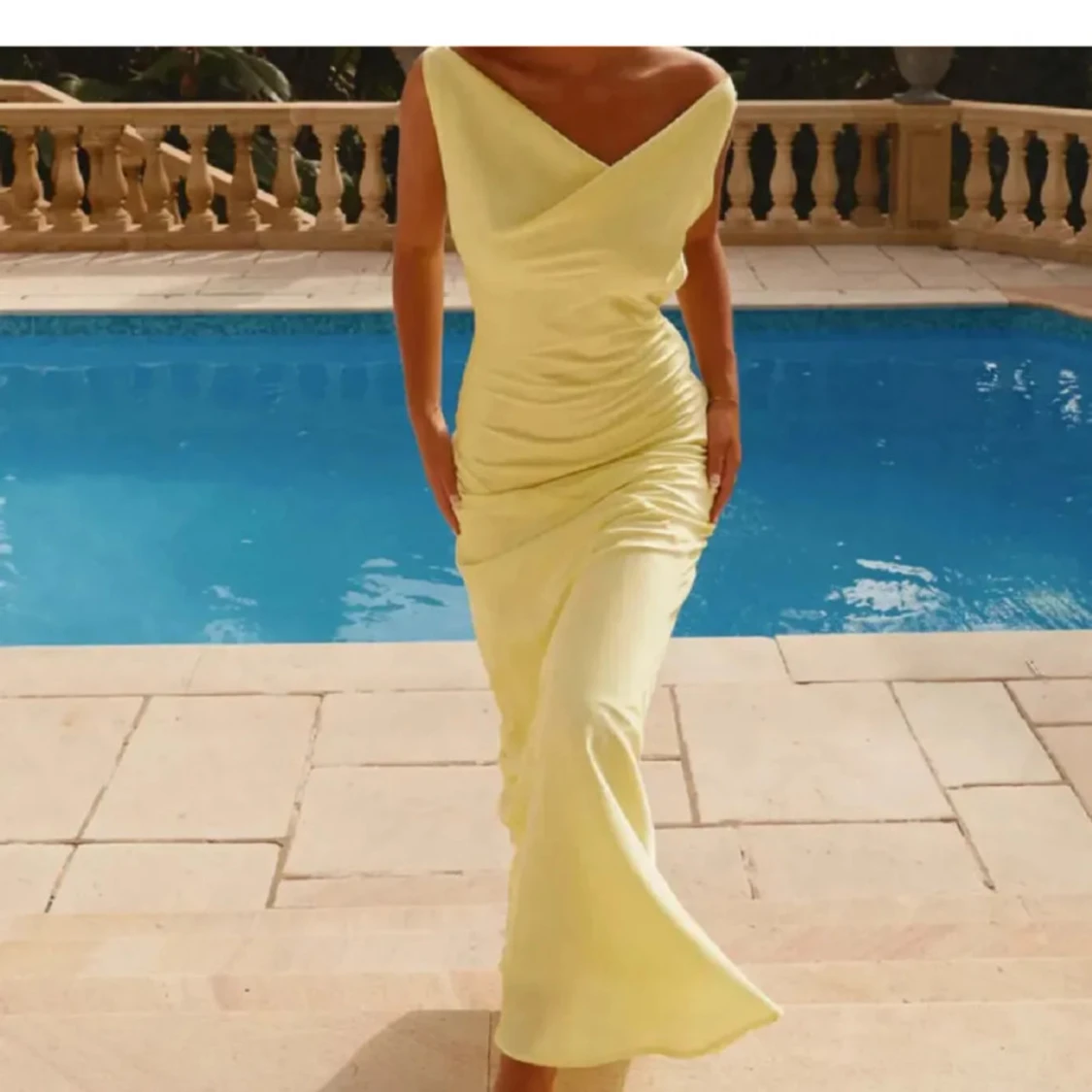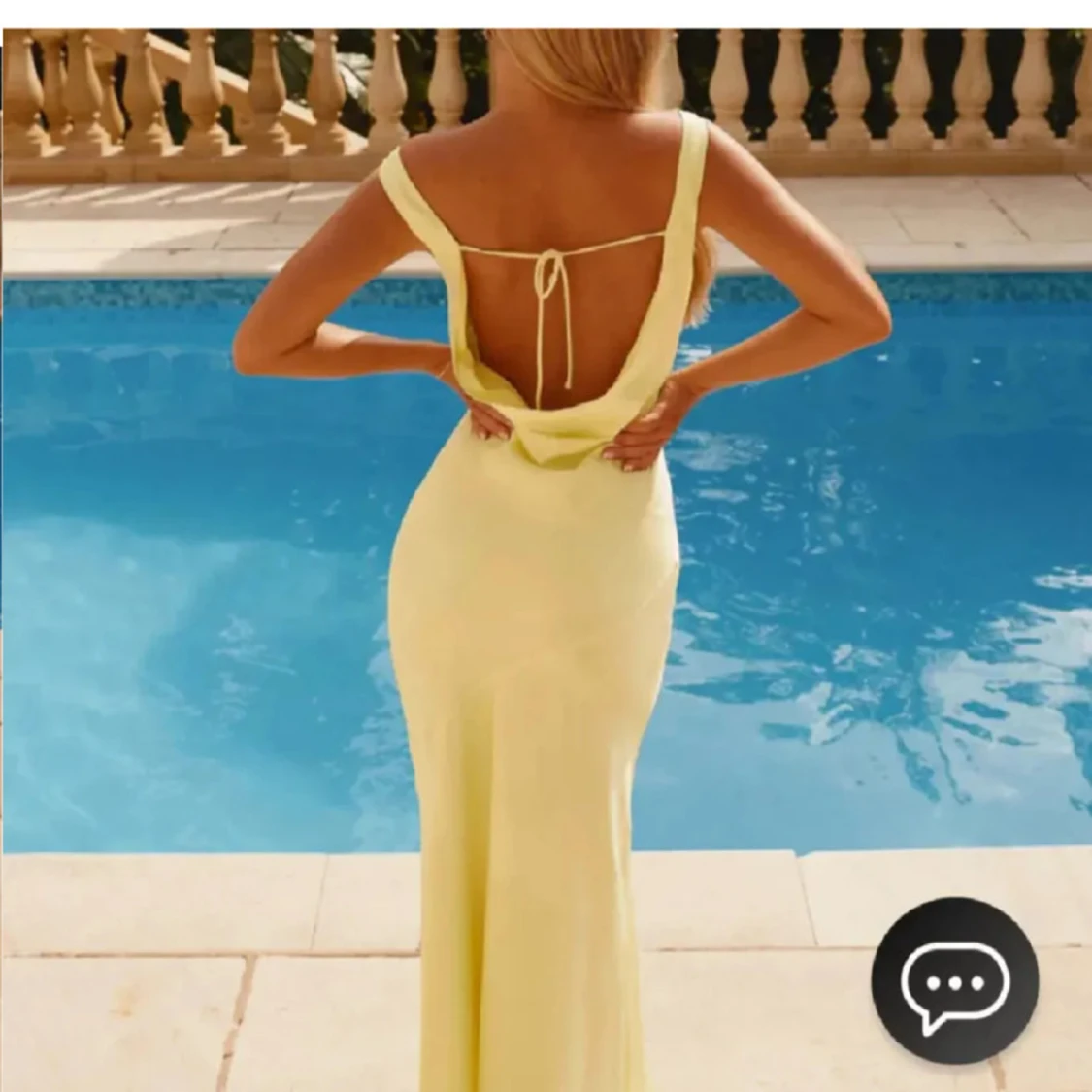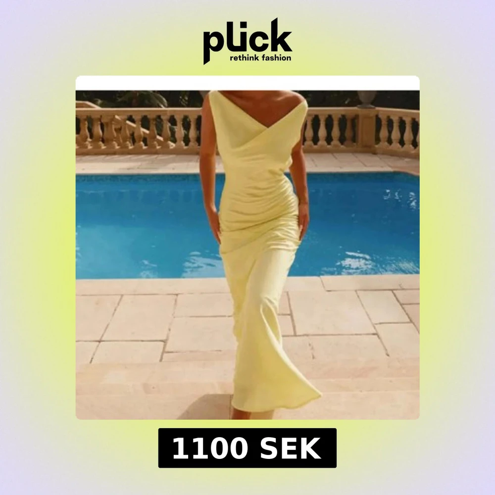 Supersnygg ljusgul långklänning med v-ringad omlott framtill och öppen rygg med knyt. Klänningen har en figurnära passform och är perfekt för sommarkvällar. Tunt, mjukt material som faller snyggt längs kroppen. Bara att skriva vid frågor eller egna bilder💗Perfekt för bal elller brölopp🥰