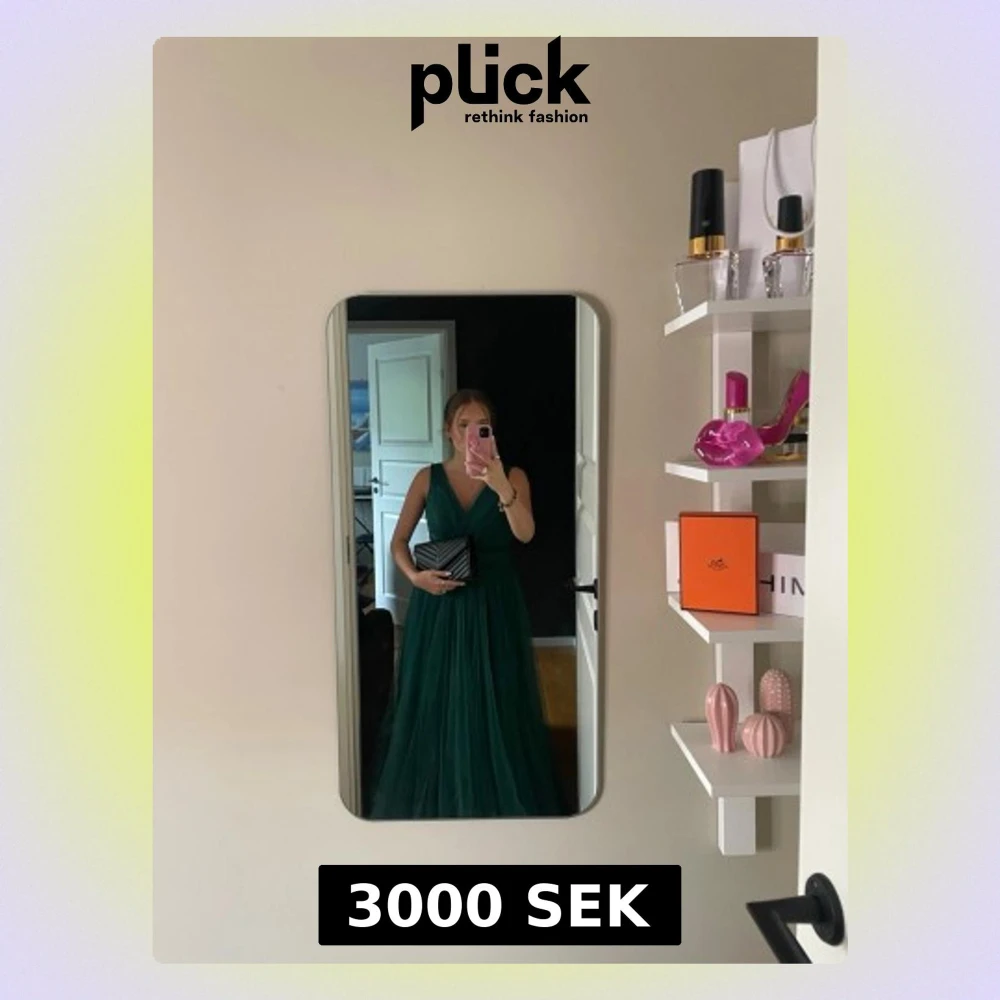 Säljer en elegant långklänning i djupgrönt med v-ringad omlott-topp och ärmlös design. Klänningen har ett luftigt, lager-på-lager tyg i tunn polyester som ger ett svepande intryck. Perfekt för bal eller student! 💚