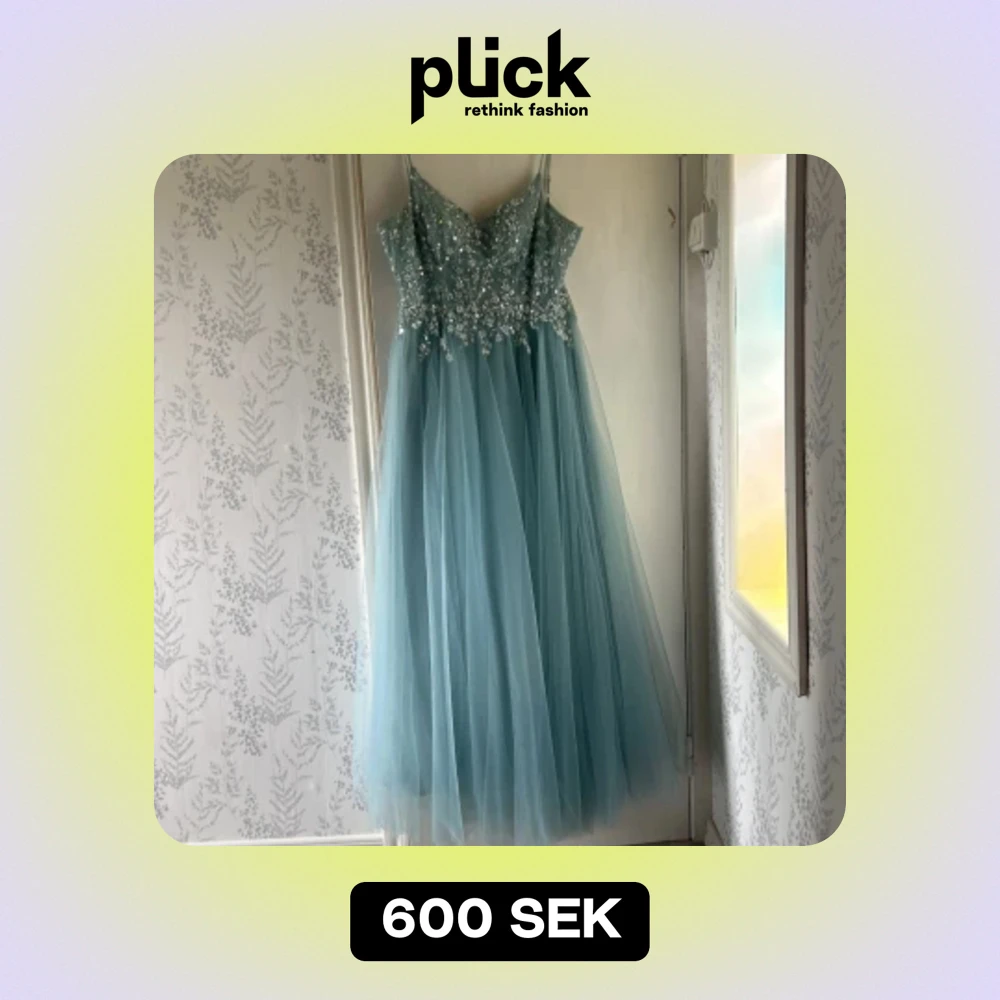 En ljusblå balklänning i storlek L. Jag har M i vanliga fall o den var lite förstor. Den är extremt snygg på o poppar med sin ljusa färg och kristaller!
