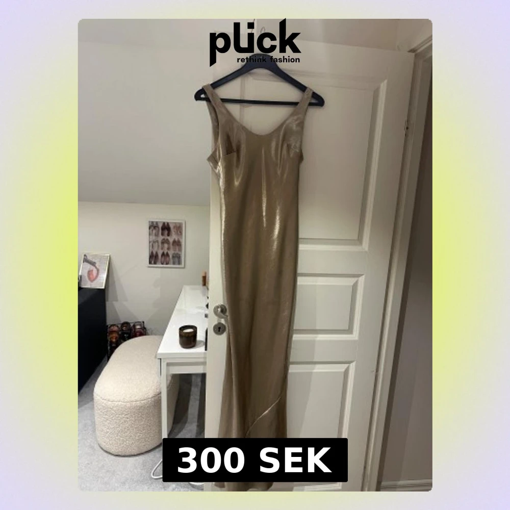 Champange färgad balklänning med djup urringning i ryggen. Storlek S/M, sitter så fint, har små defekter, men annars bra skick💛✨BUDA PÅ!!