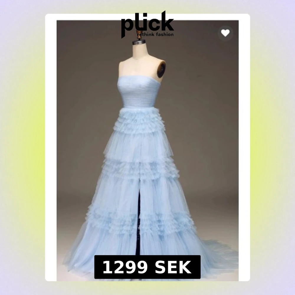 Axelbandslös tyllklänning i ljusblått med glitter. Veckad topp och flera lager tyg i kjolen. Silverglitter. Stängs med dragkedja i ryggen. Endast använd vid ett tillfälle. Den är LÅNG! Jag borde lagt upp den men istället är det smutsig i nederkant, se bilder, i övrigt i princip i nyskick. Tänker en kan lägga upp den så det smutsiga försvinner. Storlek saknas men uppskattas passa ca XS (34/36) Mått bröst mätt armhåla till armhåla rakt över ca 40 cm Mått kjollängd mätt från mi