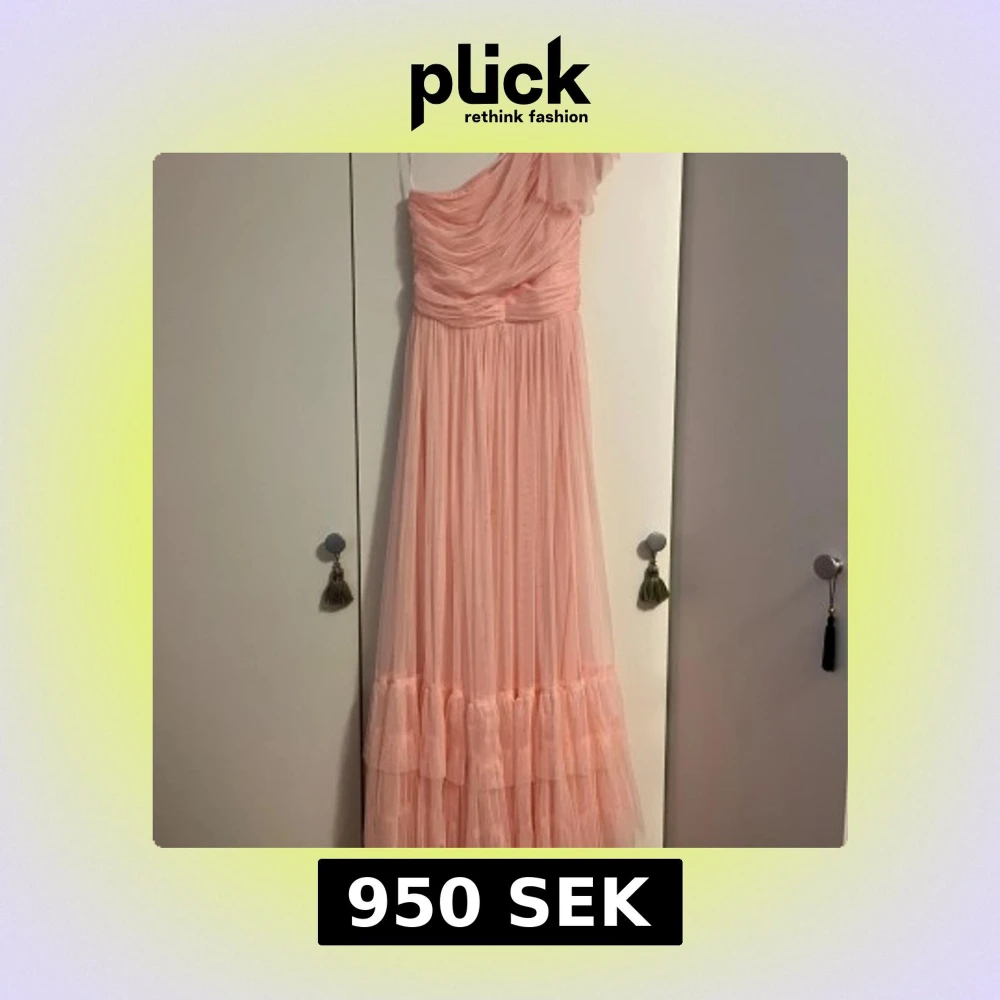 Elegant ljusrosa långklänning med oneshoulder-design och volangdetaljer.