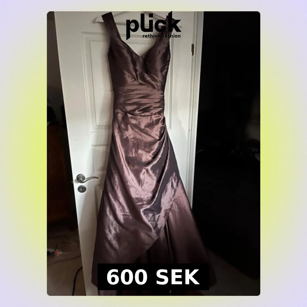 Säljer en balklänning/brun långklänning med breda axelband och v-ringad överdel. Klänningen har draperade detaljer och är tillverkad i glansigt satinmaterial som ger en lyxig känsla. Perfekt för bal eller festliga tillfällen. Dragkedja i ryggen för enkel påklädning.