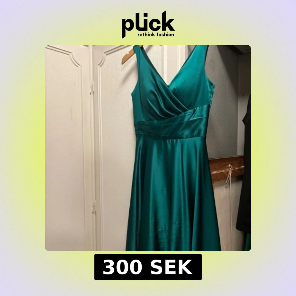 En jättevacker emeraldgrön siden balklänning med v ringning i storlek 38. Endast använd en gång men har skador på kjolen som ej syns på långt håll. Köpt för 2500kr