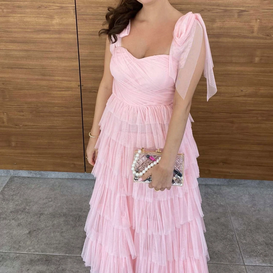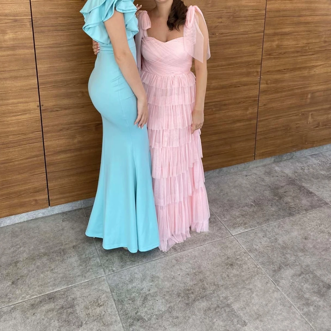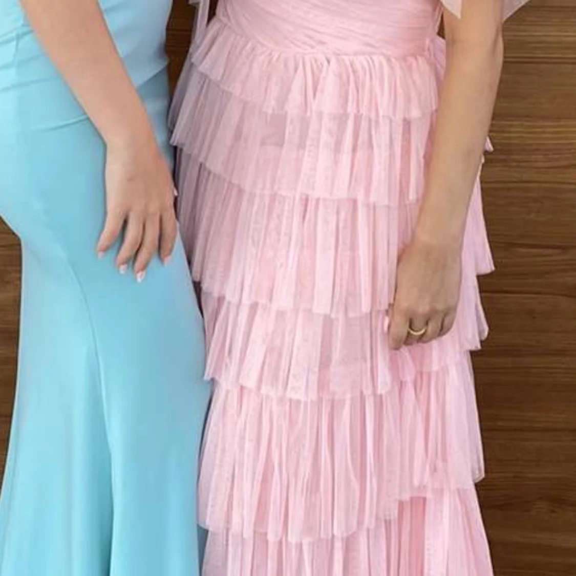 Säljer en rosa långklänning med volanger och oneshoulder-design. Klänningen har en vacker omlott-topp och är perfekt för speciella tillfällen. Den är tillverkad i ett lätt och luftigt material som ger en drömlik känsla. Klänningen är köpt från Lace and beads hemsidan och har bara använts en kväll. Priset kan diskuteras vid snabb affär.