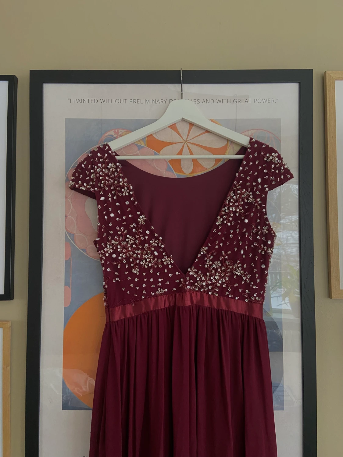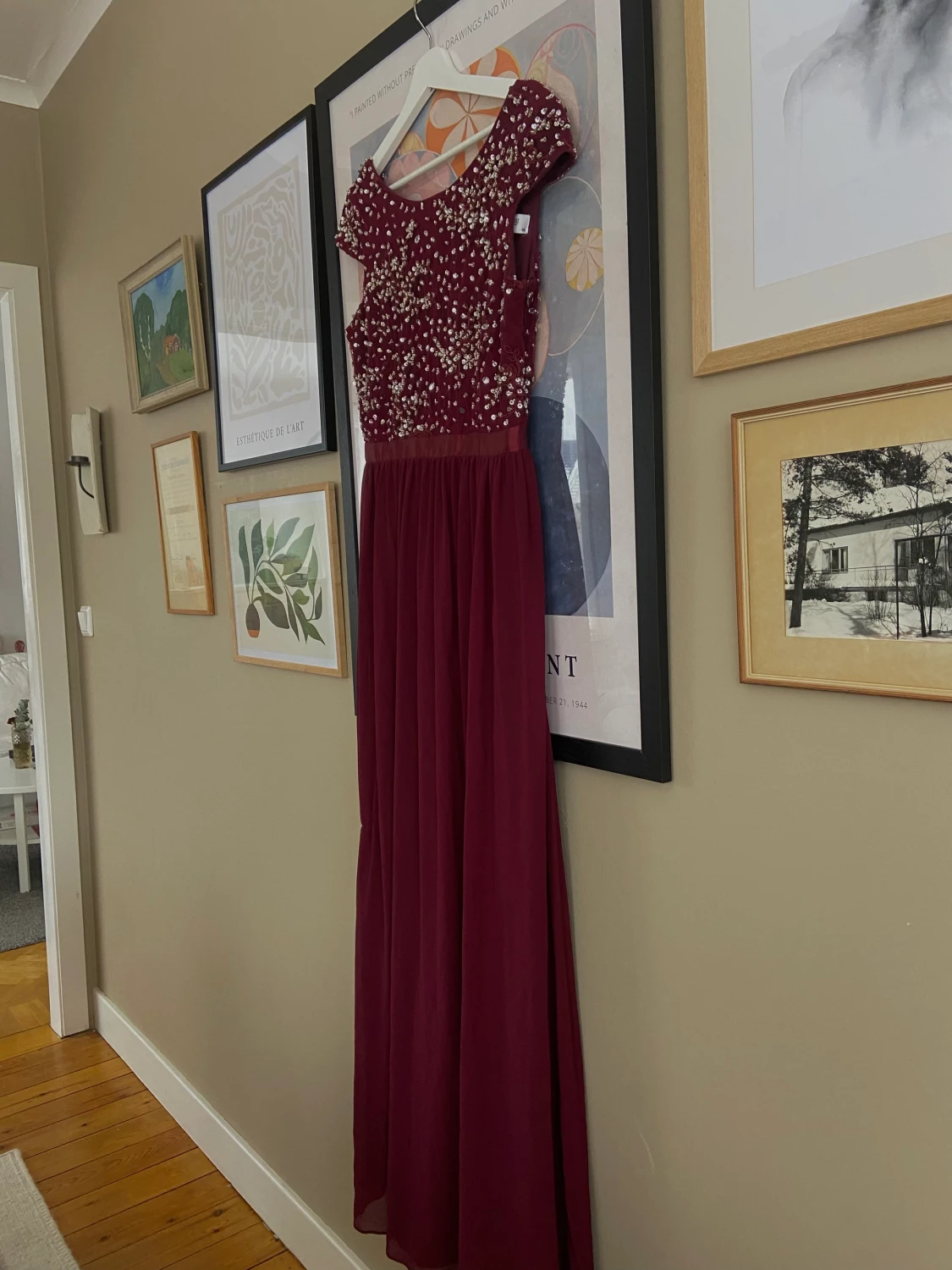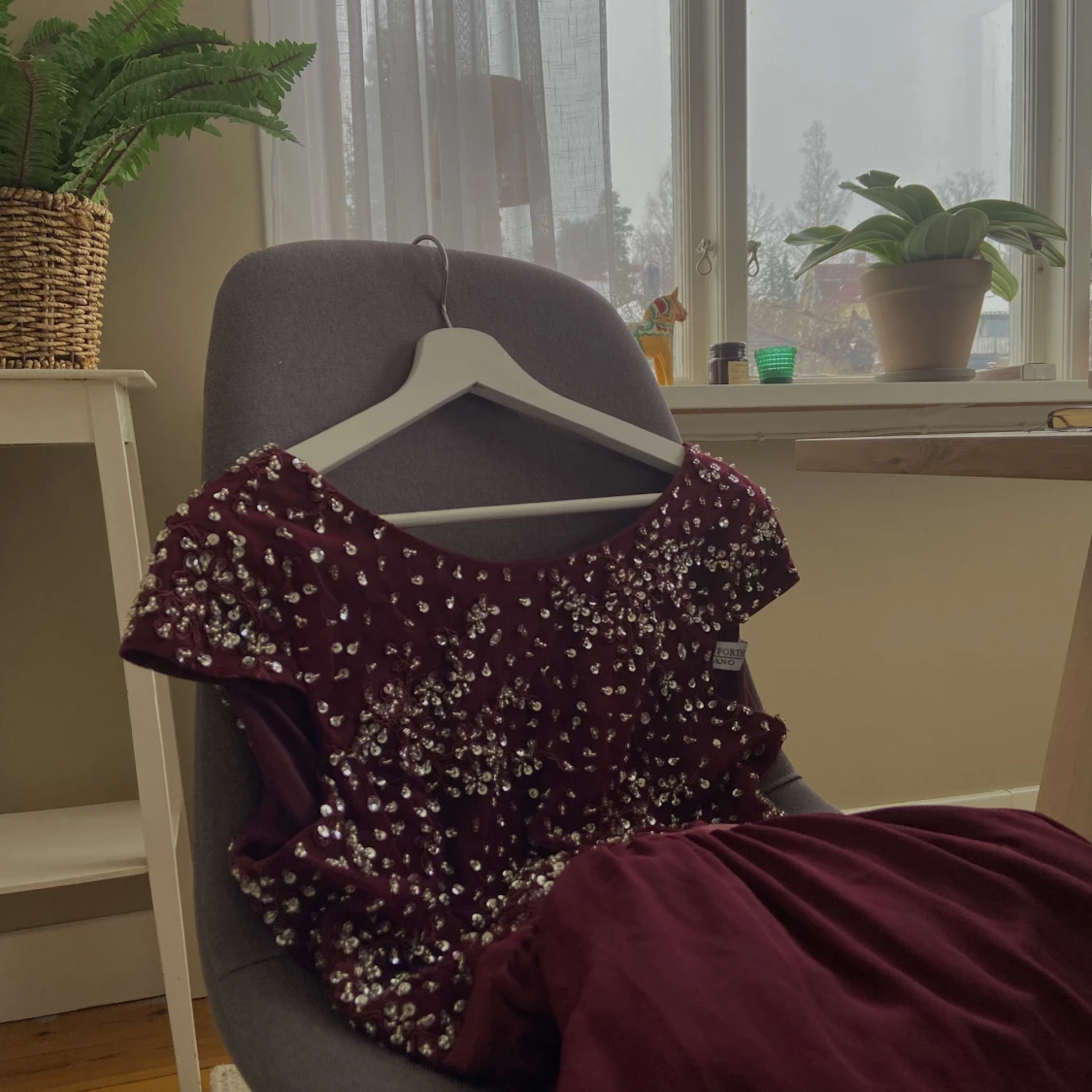 Min gamla balklänning från 9an, uppsydd så passar en person som e 170 cm med låga klackar! Vinröd med paljetter och låg rygg, för fler bilder skriv privat!💕använd 1 kväll, sen aldrig :)