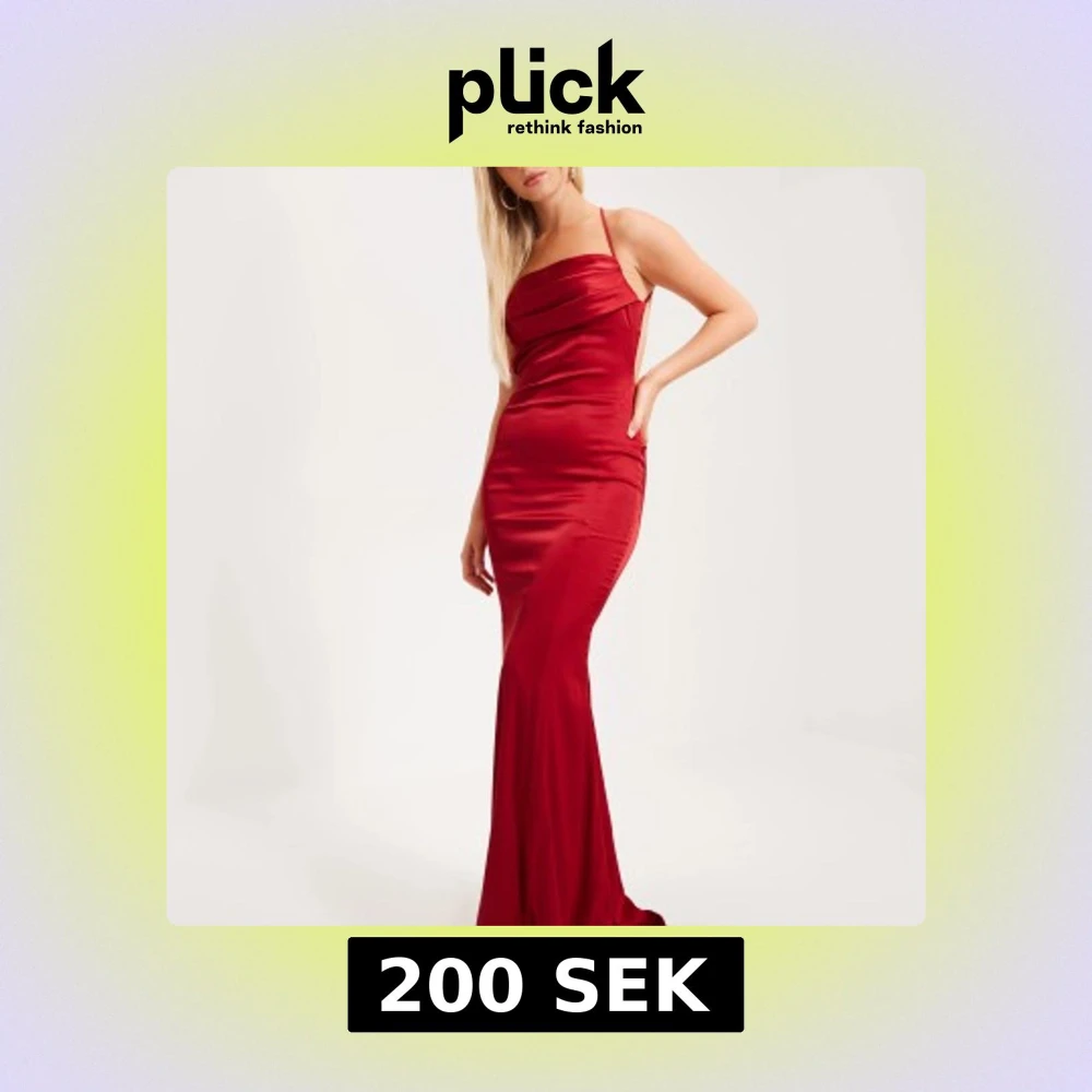 Röd balklänning i satin med smala axelband och en vacker öppen rygg. Klänningen har en figurnära passform. Passar mig som vanligtvis har storlek S. Endast använd engång men hade behövt tvättas då där är fläckar på släpet 🫶