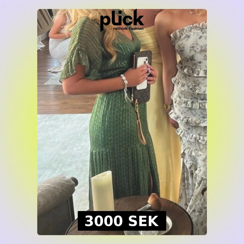 LÅNADE BILDER- Grön långklänning med v-ringning, korta volangärmar och slits framtill. Klänningen har ett glittrigt mönster i guldtoner och markerad midja. Tillverkad i ett lätt, luftigt material som ger ett elegant fall. Perfekt för sommarens alla tillfällen. Klänningen är från märket BA&SH och säljs inte längre 🥰🥰 nypris var runt 5000🩷