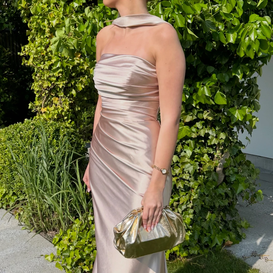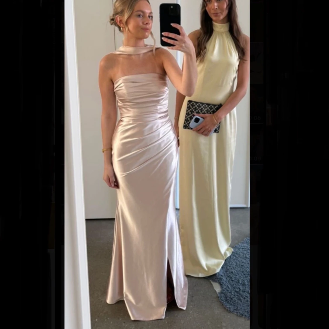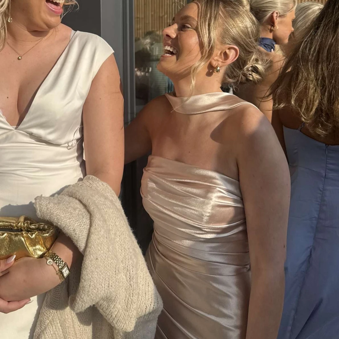 Jättefin ljusrosa/champagne färgad balklänning! Använd endast en gång. Man får med handskar (har ej använt dessa). Man får även med den”påsen” man kan förvara balklänningen i. Från dressroom linne, nypris 4000 kr. Väldigt fint skick!! Den är uppsydd hos en skräddare. Jag är 160 cm lång och den går ner till golvet. Klänningen har inbyggd bh och slits nertill. Storlek 32. Mina mått för referens: - Höft 84cm - Midja 63 cm - Byst 80cm Skriv om du har frågor🫶🏼
